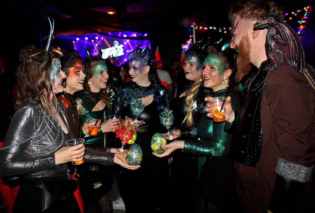 Und wie immer fanden sich die schönsten Masken und Verkleidungen im Saal ein. Mit der größten Gruppe kamen die „Drachenladies“ mit ihrem „Drachenritter“. „Heuer haben die Drachenladies alles selber genäht, selbst die leuchtenden Dracheneier gebastelt, das Make-up entworfen und den Feuerball fabriziert“, sagte der Drachenritter, der auf seine Drachengruppe aufpasste. Und da waren noch die vier Bösen. Im „Club der Bösen“, trafen sich Florian, der Teufel, mit Teufelsbraut Sandra, Todesengel Conny und der Hexe Sonja. Sie waren in den letzten Jahren immer beim Sportlerball. „Wir finden diesen Ball fetzig und närrisch“, sagte Conny.