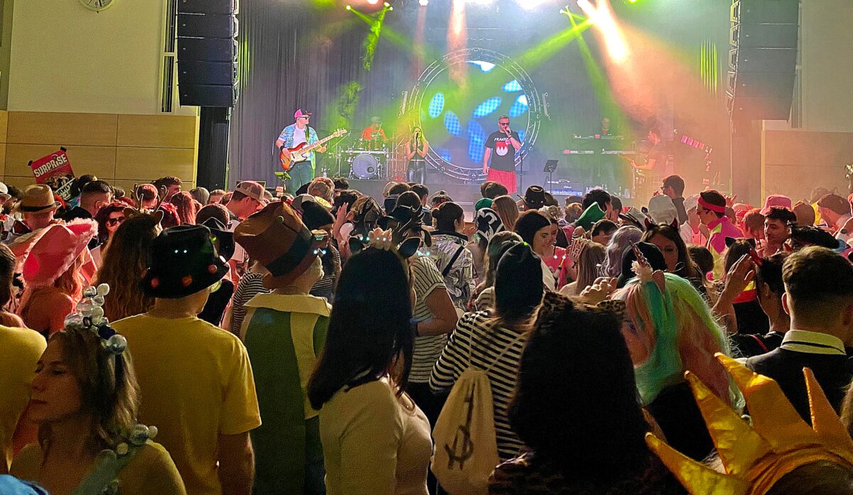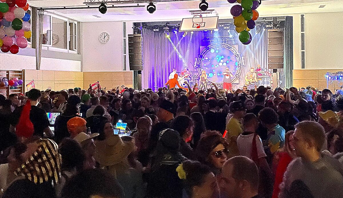 Schon vor der Happy-Hour-Stunde ab 21 Uhr strömten die Gäste in die Halle. Schnell füllten sich Steh- und Tanzfläche, an den drei Bars für Bier, Schnaps und Cocktails bildeten sich Doppelreihen. Die Partyband „Surprise“, die bereits 1986 beim Sportlerball aufspielte, heizte dem Publikum kräftig ein. Lichtorgien und Faschingshits ließen das Stimmungsbarometer rasch steigen.