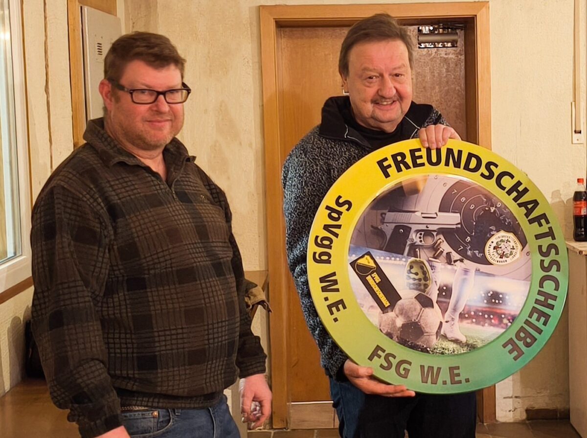 Die Fußballers stellten bei dem freundschaftlichen Wettkampf ihre Treffsicherheit unter Beweis. Es zeigte sich, dass Sie nicht nur mit dem runden Leder regelmäßig ins Schwarze treffen. Auch mit dem Kleinkalibergewehr auf 50 Meter sind sie sehr zielgenau. Es wurde eine Freundschaftsscheibe ausgeschossen, die zukünftig im Vereinsheim der Fußballer zu bewundern ist. Die Scheibe wurde von Thomas Tichy, dem 3. Vorstand der Feuerschützengesellschaft, gestiftet und von Werner Meinert, dem 2. Vorstand der Spielvereinigung, gewonnen. Er war auch mit Abstand der beste Schütze des Tages, ein grandioser Start-Ziel-Sieg, als erster Schütze gestartet, und niemand konnte ihn mehr einholen. Ihn wünschen wir weiterhin gut Schuss sowohl aufs Tor als auch auf die Schützenscheiben.