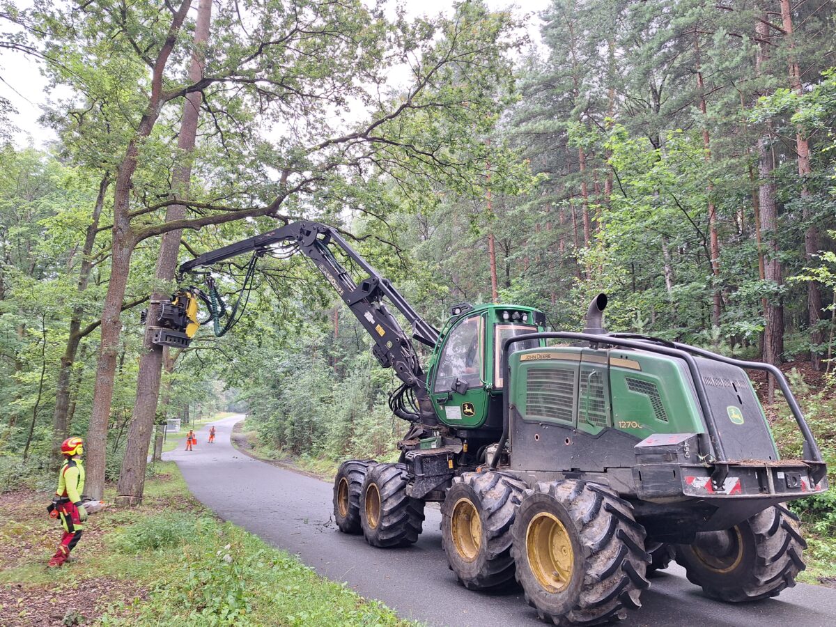 Sperrung an der Felsmühlstraße. Große Harvester bearbeiten die Bäume. Die Straße war lange gesperrt. Dies führte zu Verkehrsbehinderungen und zum Unmut der Autofahrer. Forstrevierleiter Martin Gottsche erklärte nun die Maßnahme.