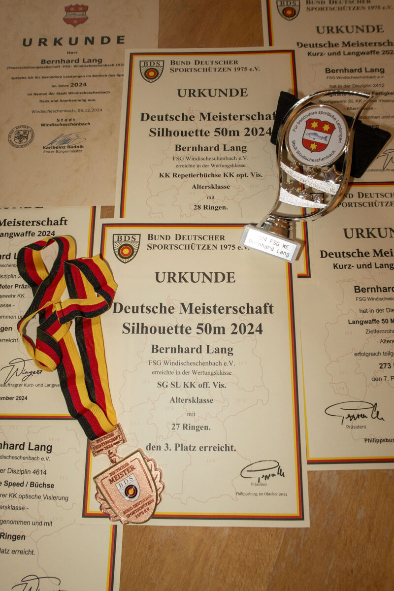 Erich Sperber überreicht die Urkunden und Pokale an die erfolgreichsten Schützinnen und Schützen. Für die Leistungen bei der Bayerischen und Deutschen Meisterschaften erhielten die Teilnehmer die Pokale. Bernhard Lang bekam zudem einer Bronze-Medaille für den dritten Platz bei der Deutschen Meisterschaft in er Disziplin Silhouette. Die Ehrung erhielten Heike Bäumler, Adolf Bösl, Richard Bäumler, Klaus Brunner, Bernhard Lang, Josef Garban, Eugen Joachim, Thomas Kleeberg, Jochen Römisch, Peter Sieber und Thomas Wildgans.