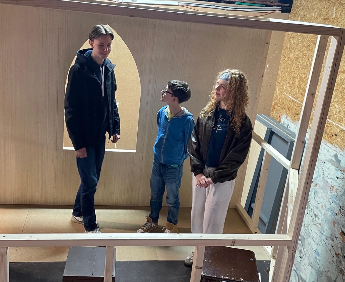 Am Wochenende probte das Ensemble des Kinderstücks das erste Mal in Teilen des Original-Bühnenbildes. Um sich an die Ausmaße des Rapunzel-Turms zu gewöhnen, wurde dieser in der Werkstatthalle aufgebaut. Zwar befindet sich der Turm noch im Rohbau, aber zumindest mit den Platzverhältnissen können sich die Darstellerinnen und Darsteller so schon einmal vertraut machen. Während nebenan noch an anderen Teilen des Bühnenbildes gesägt und geschraubt wird, probt das Ensemble fleißig an den Szenen des eigens für den Kultursommer völlig neu geschriebenen Stückes. Damit verspricht „Rapunzel“ ein ganz besonderes Highlight im Kultursommer zu werden.