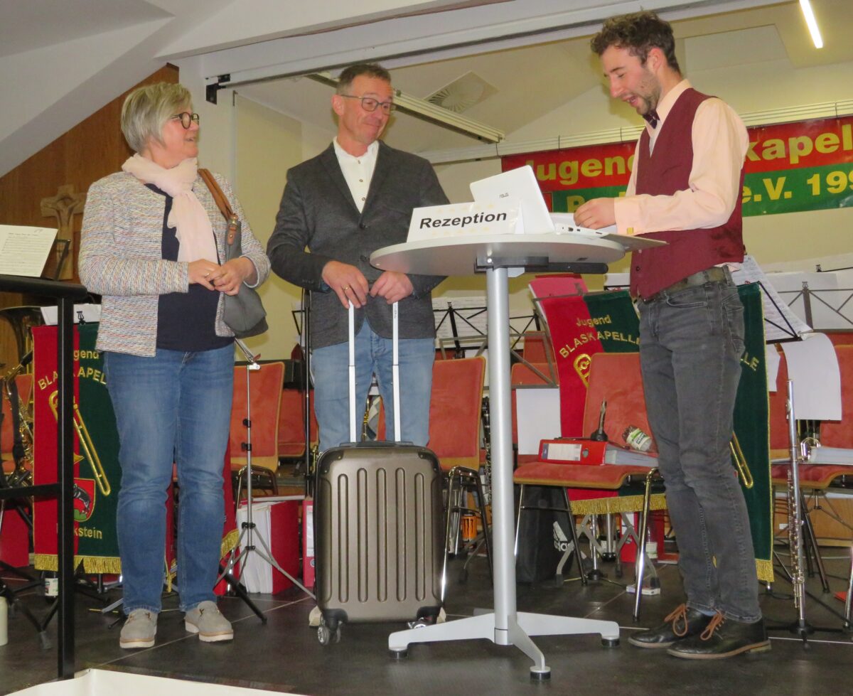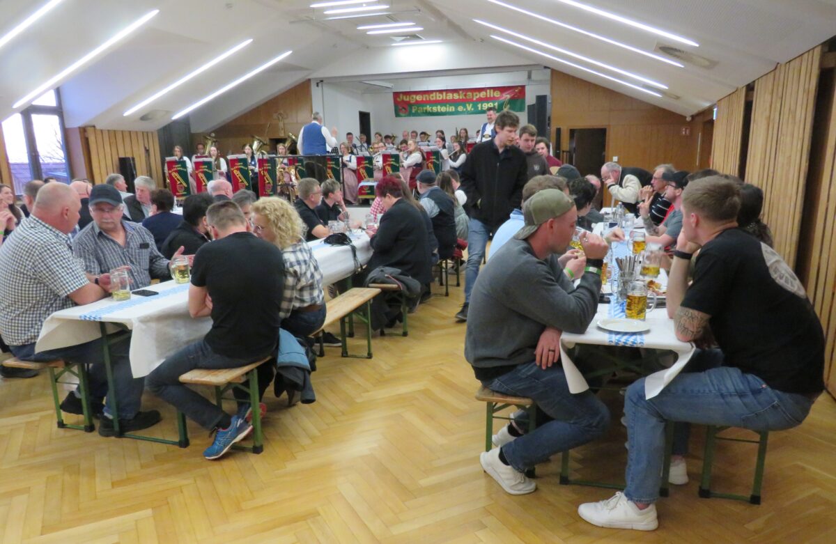 So wurden die Gäste schnell mitgenommen. Bei vielen Stücken klatschten und schunkelten die Starkbierfreunde. Sehr oft sangen die Gäste die Lieder auch mit. Auch modernere Stücke nahmen die Starkbierfreunde mit auf die musikalische Reise. In der Pause präsentierten Heinz Rast, Florian Simmerl und Anita Bösl den Sketch „An der Rezeption“. Für ihren humorvollen Auftritt ernteten sie großen Beifall. Zu süffigen Starkbier und anderen Getränke servierten die fleißigen Helfer deftige Brotzeiten. An 21 Uhr servierte der Burschenverein schärfere Getränke. Bis spät in den Abend feierten die Parksteiner mit ihrer Jugendblaskapelle.
