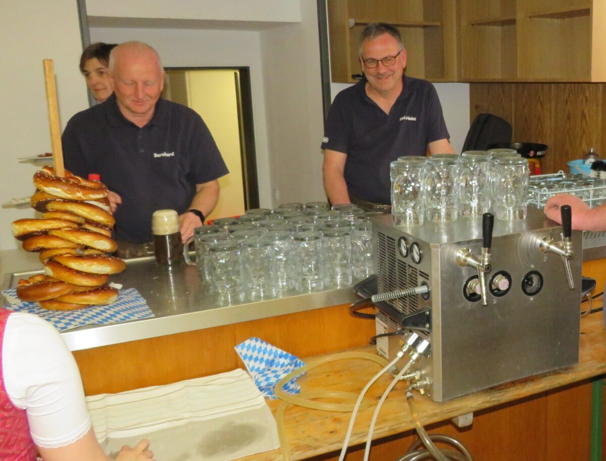 Pünktlich um 19.30 Uhr zapfte Bürgermeister Reinhard Sollfrank mit zwei Schlägen das erste Fass Brauerei Scheurer an. Mit einem Prosit der Gemütlichkeit stieß er mit Kapellmeister Alfons Steiner und Gisela Witt an und genoss den ersten Schluck.