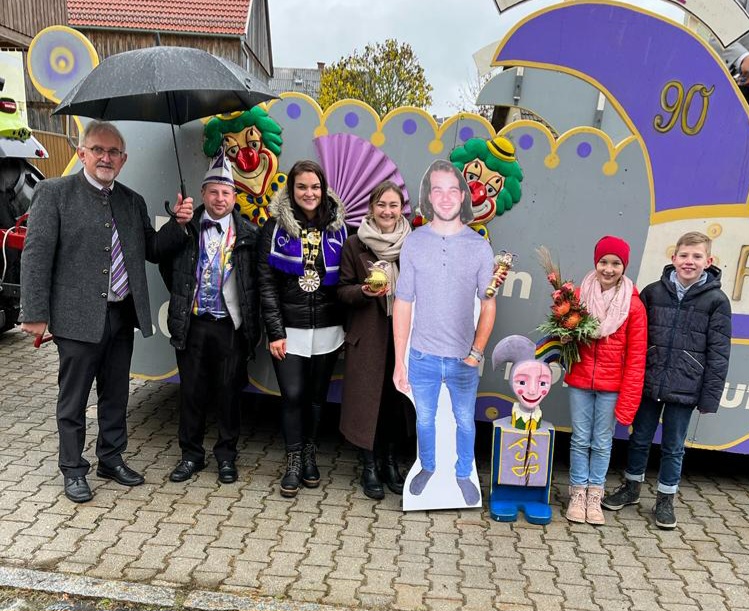 Dann ging es mit einem Zug angeführt vom Prunkwagen mit allen Aktiven zum Rathaus, wo pünktlich um 11:11 Uhr die Proklamation startete. Zunächst verabschiedete Präsidentin Eva Frischholz das letztjährige Prinzenpaar und begrüßte die neuen Paare. Kinderprinzessin Theresa I. (Schönberger), Kinderprinz Simon I. (Würth) und Prinzessin Katharina II. (Luber) begrüßten das närrische Volk mit einer kurzweiligen Rede. Aber da fehlte doch einer? Tatsächlich war Prinz Franz I. (Spörrer) nur in Form eines Pappaufstellers zugegen, weil der richtige Prinz an diesem Wochenende in London weilte.