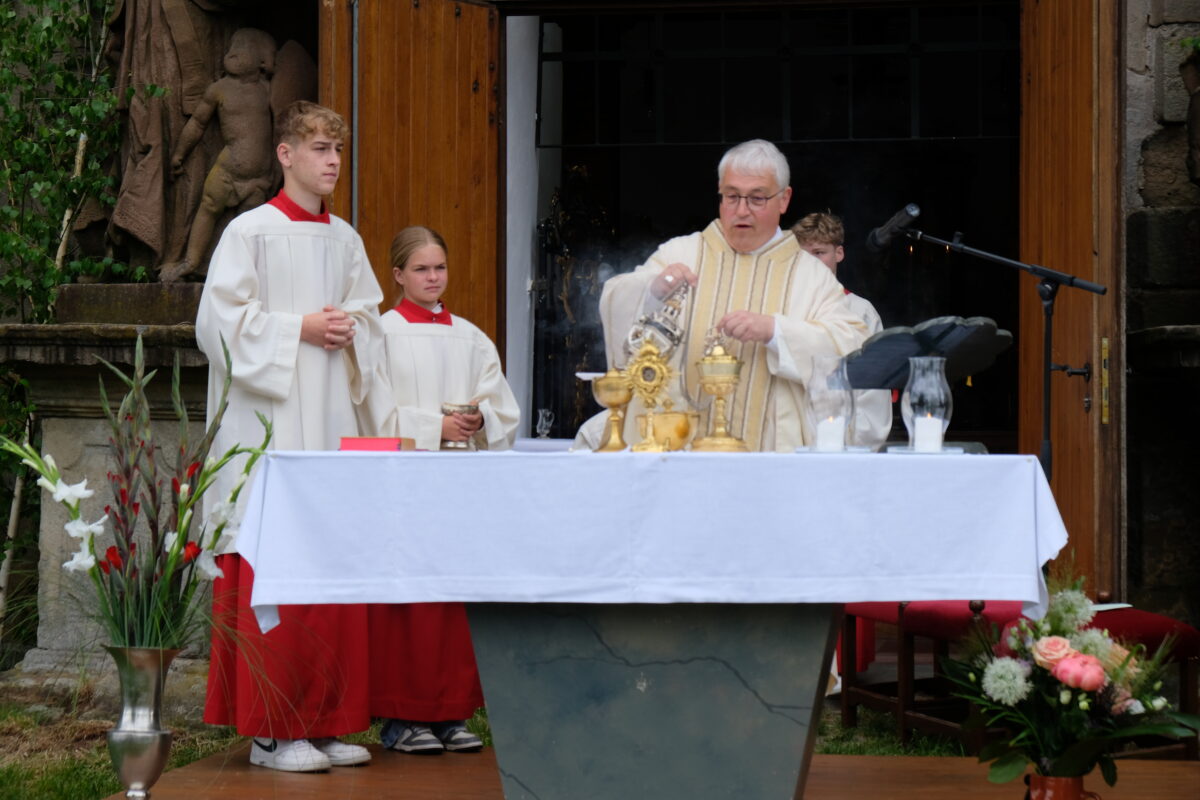 Auf dem Plateau vor der barocken Kulisse der Kapelle beleuchtete Abt em. Hermann Josef Kugler, Administrator des Klosters Speinshart, im eucharistischen Teil des Reitertreffens die Botschaft vom Hochfest Christi Himmelfahrt, das Vermächtnis des Herrn umzusetzen, ein gesegnetes Reich auf Erden anzustreben, Verantwortung für die Welt zu übernehmen und dem Wort Gottes ein persönliches Gesicht zu geben. Musikalisch begleiteten die Kaibitzer Schlossbläser unter Leitung von Hornmeister Ely Eibisch den Festgottesdienst. Das Mitwirken der Jagd- und Parforcehorn-Bläser hat eine lange Tradition. Der Feldgottesdienst endete mit dem Segen Gottes für Mensch und Tier.