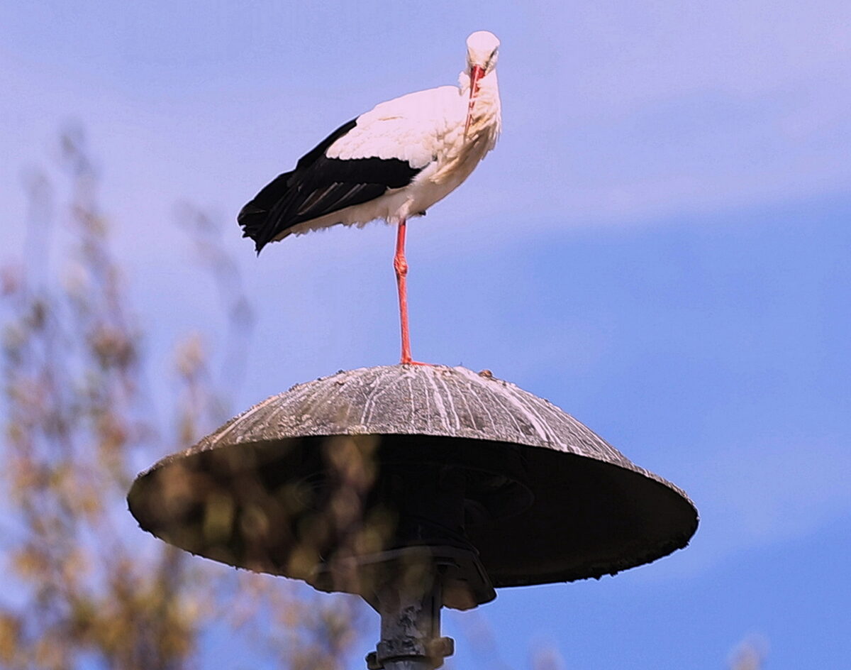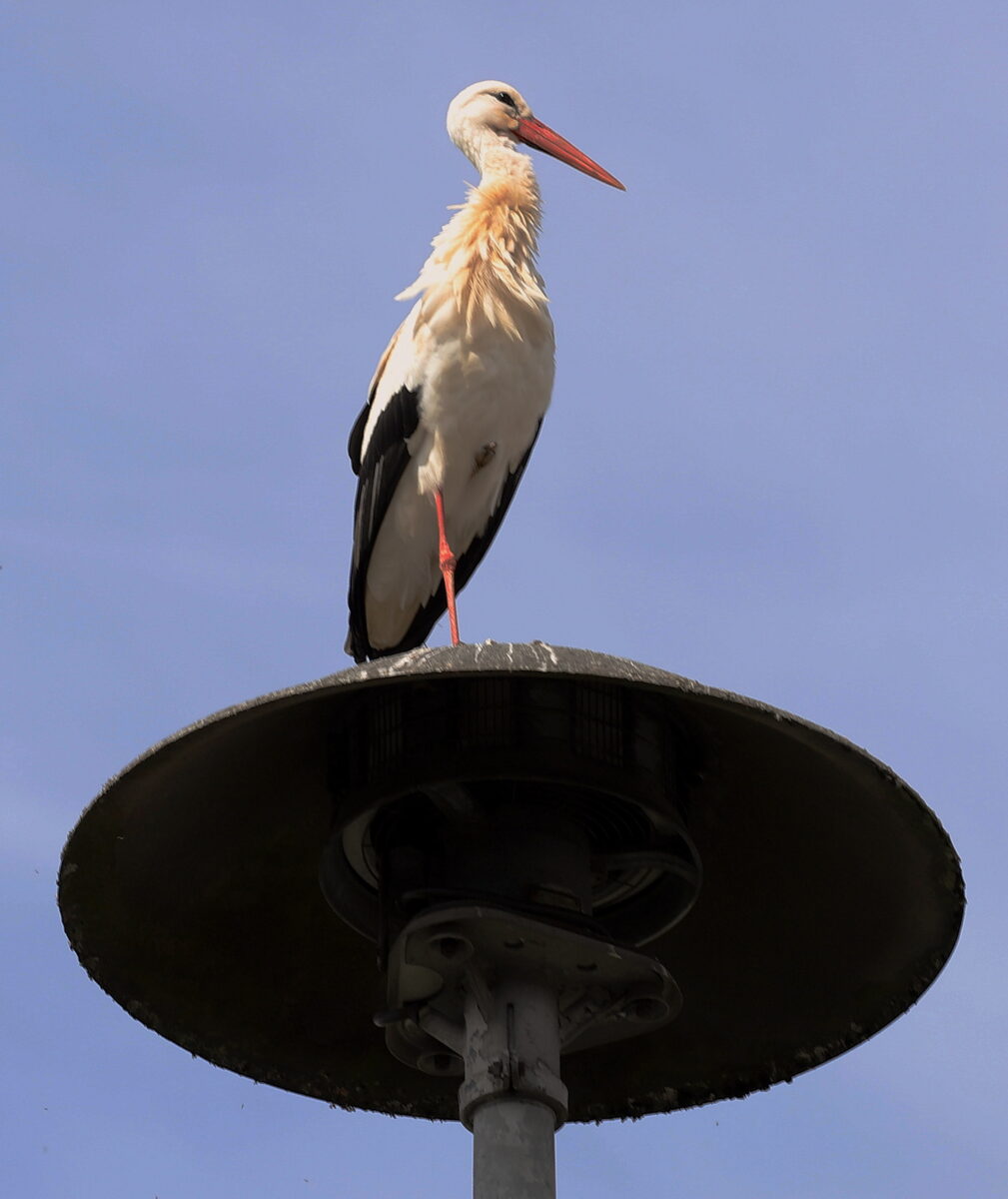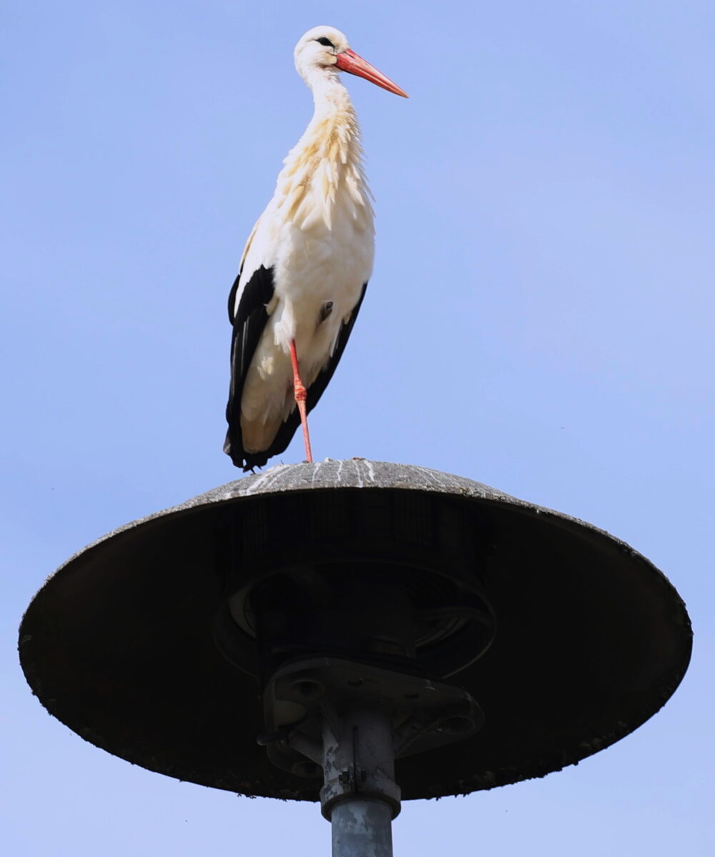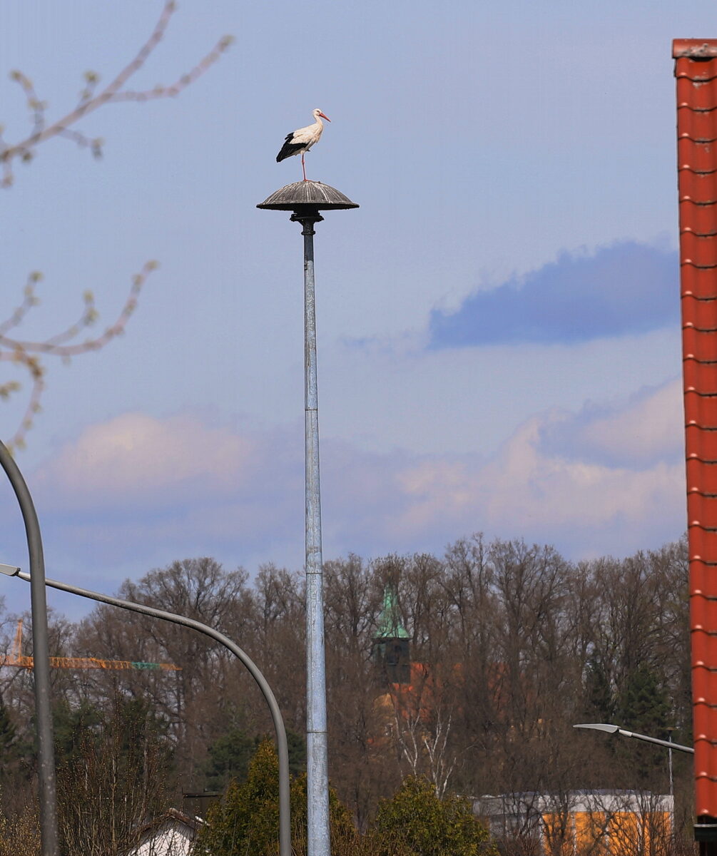 Meister Adebar nähert sich offenbar dem Ziel einer Rückkehr und lässt sich zunehmend öfter im Dorf blicken. Sein inzwischen häufiger Landeanflug ist hier allerdings gut einen Kilometer und keine zwei Flugminuten vom Horst auf dem Pfisterhof entfernt. Wie wir Ende März berichteten, hat Adolf Küblböck vom LBV das Nest im Dorfzentrum wieder topfit gemacht, gesäubert und das Dach in der Umgebung des Horstes mit womöglich die Vögel lockender weißen Farbe gestrichen. Der weiße Rand ist offenbar ein Muss, denn die Oberfläche der hochragenden Sirene hat der außergewöhnlich gepflegte Vogel gut sichtbar selbst gestaltet.