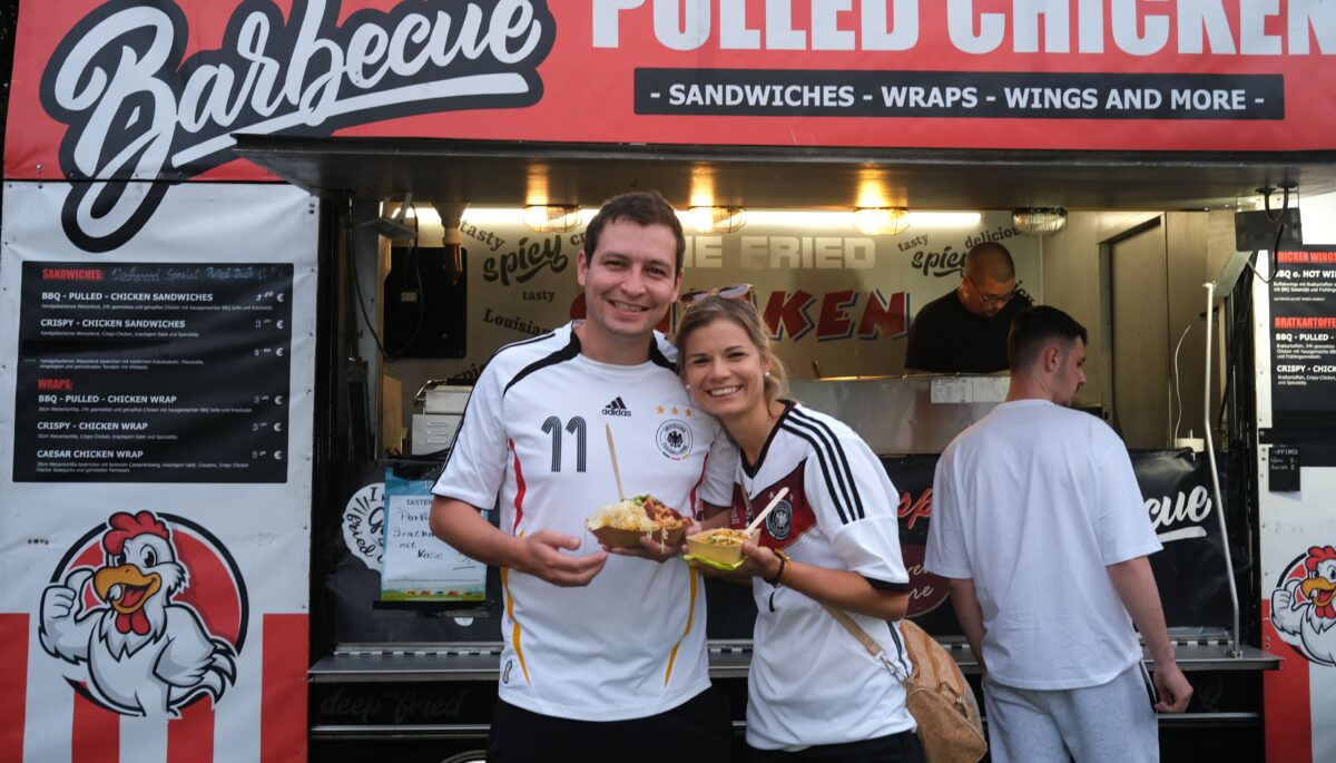 Auf dem angrenzenden Kioskgelände des Stadtparks fieberten am Freitag Hunderte von Fußballfans beim Public Viewing mit der Nationalmannschaft mit und gingen nach dem unglücklichen Ausscheiden enttäuscht nach Hause. Nur wenige hatten nach der Niederlage noch Appetit auf Burger, Tortillas und Pacos. Lena Maierl und Klaus Möschl aber steckten die Enttäuschung schnell weg, schlenderten vorbei an den 20 Food-Trucks und entschieden sich schließlich für den Barbecue-Grill, der Pulled Turkey, Crispy Chicken und Pulled Duck im Angebot hatte.