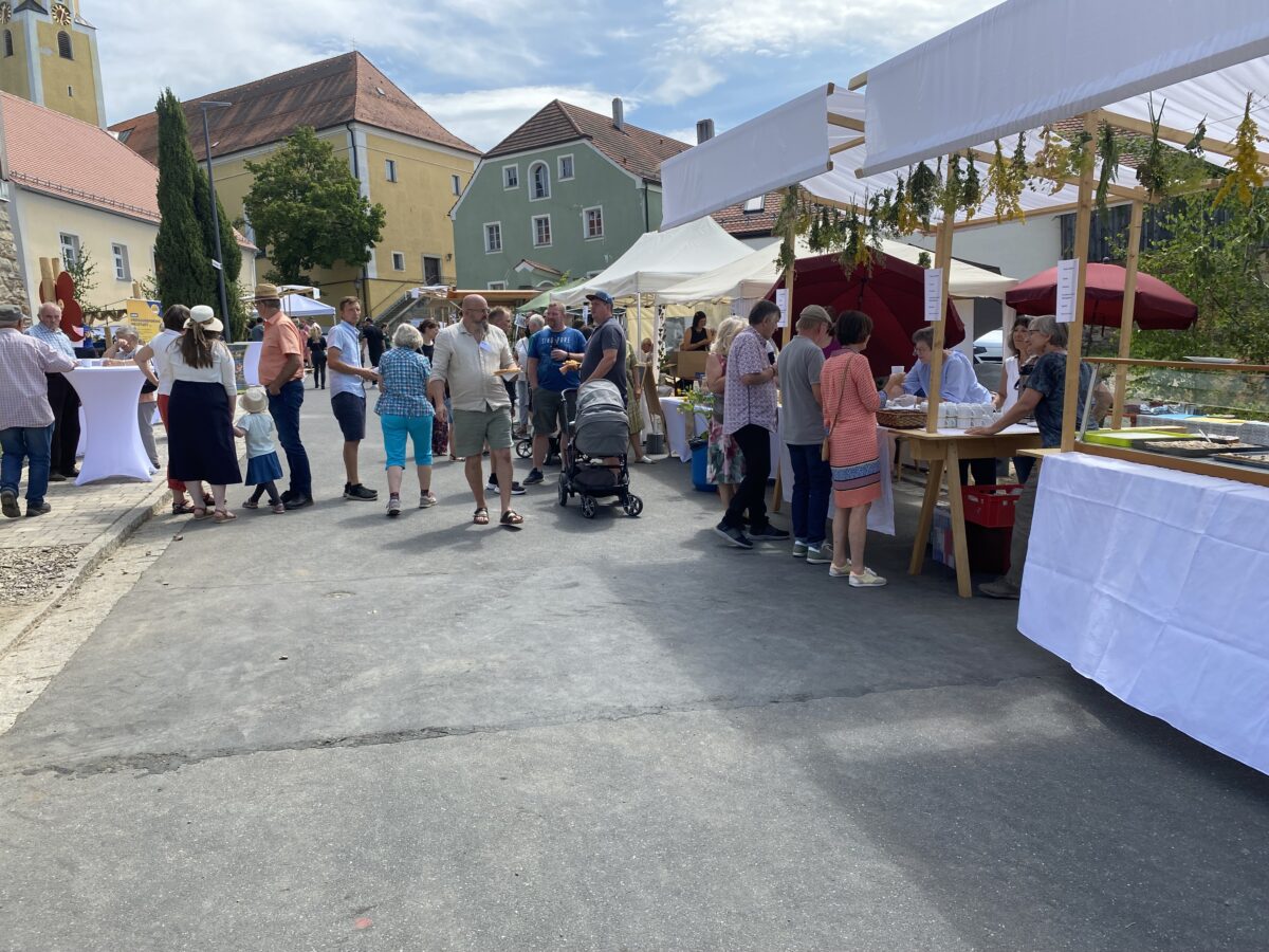 Passend zur Veranstaltung konnte man aus einem breiten Angebot von regionalen Produkten wählen. So gab es Langosch aus Dinkelmehl und Eiern aus der Modellregion, Rotviehburger vom Roten Höhenvieh, Gemüseburger und selbst gebackene Küchel, neben Kaffee und Kuchen Quarkbrote mit sämtlichen Kräutern aus dem Garten, Spezialitäten vom Tännesberger Rotvieh, Säfte und Hochprozentiges aus Früchten von heimischen Streuobstwiesen, Bier und alkoholfrei Getränke von Herstellern aus der Region, Eis aus biologischen Zutaten und das hochwertige Tännesberger Trinkwasser, frisch geschöpft aus der Quelle.