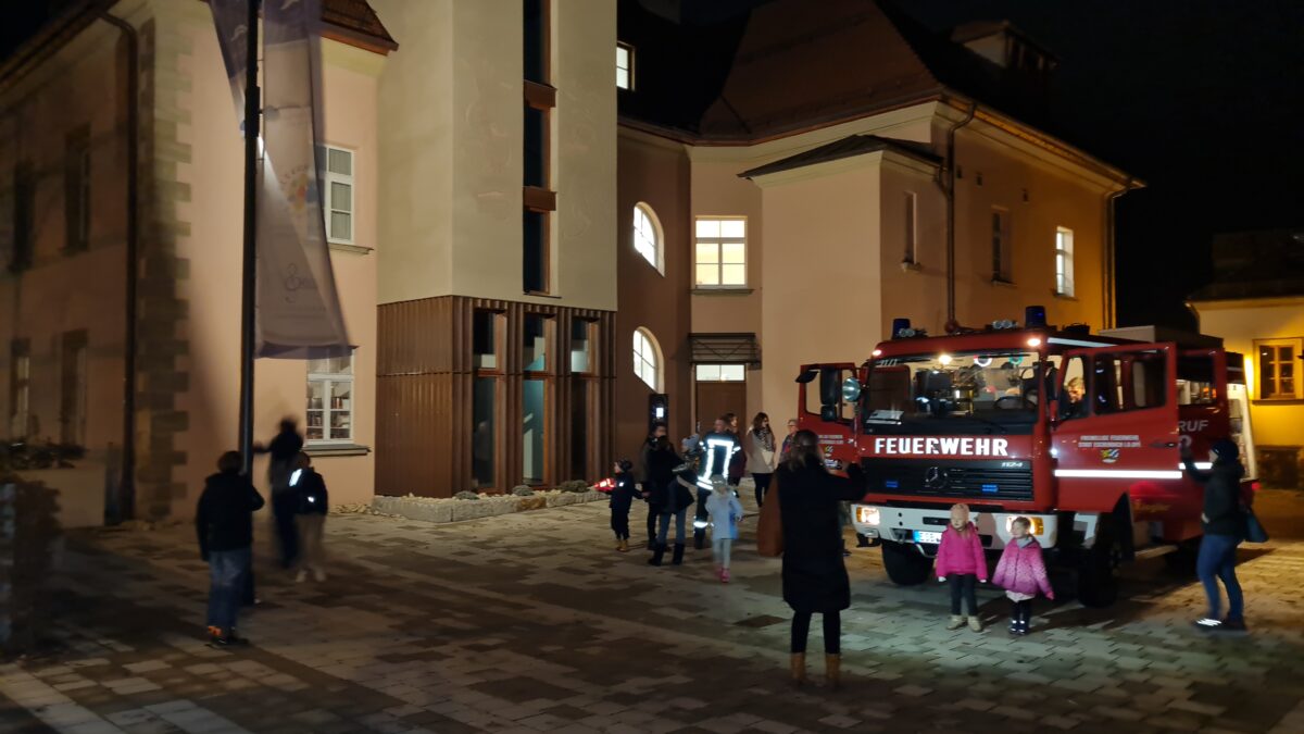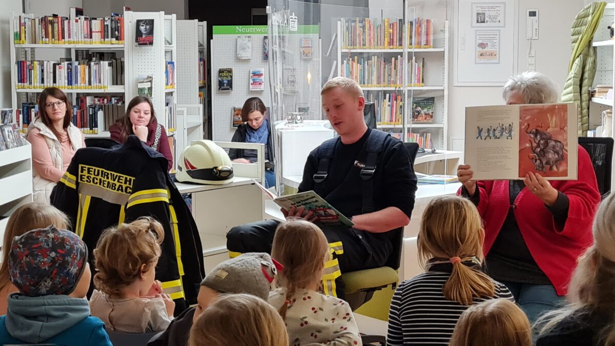 Schon bei der Ankunft umrundeten die Kinder staunend das im Hof geparkte Löschfahrzeug der Freiwilligen Feuerwehr Eschenbach. Zuerst jedoch wurden alle großen und kleinen Besucher in die Bibliothek gelotst, in der der diesjährige Lesepate, der Feuerwehrmann Patrick Dobmann, die Bilderbuchgeschichte „Bei der Feuerwehr wird der Kaffee kalt“ von Autor Hannes Hüttner vorlas.