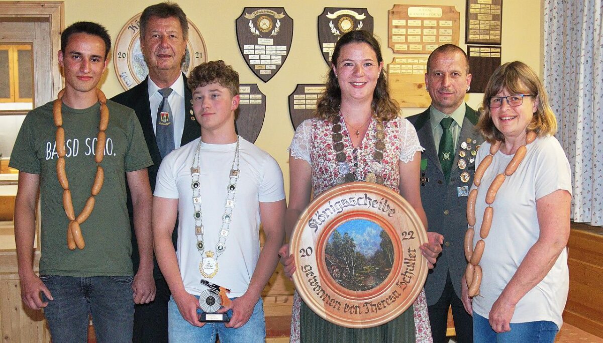 Bei der anschließenden Preisverteilung wurden dann die verschiedenen Pokale, Ehrenscheiben und Gutscheine an die Gewinner überreicht und die neuen Könige geehrt. Theresa Schuller ist die neue Schützenkönigin, Elias Schmid der neue Jugendkönig. Am Ende der Königsproklamation erhielten alle Teilnehmer noch eine Brotzeit.