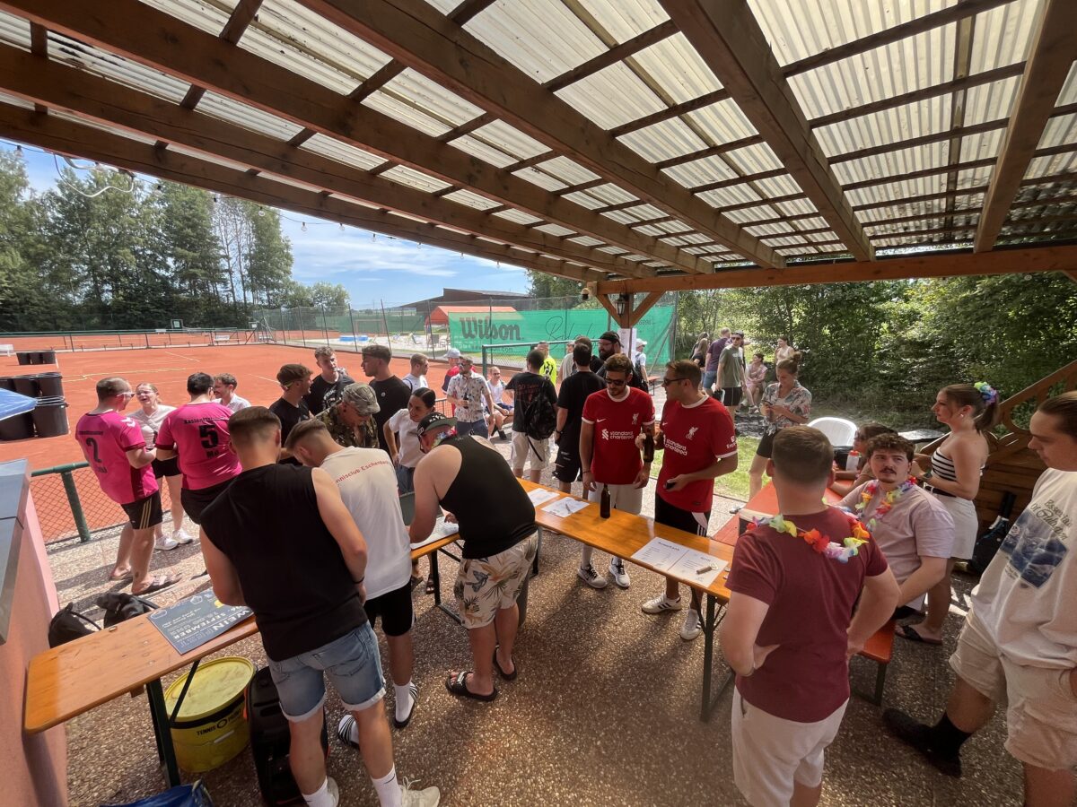 Mit Sonnenschirmen, Palmen-Deko und passender Musik kam sofort Urlaubsfeeling auf. Insgesamt 24 Teams traten in spannenden Matches gegeneinander an. Statt Tisch und Bechern galt es diesmal, den Tennisball mit einem Tennisschläger in die Eimer auf der anderen Seite des Netzes zu versenken – nach Spielregeln, die an das klassische Beerpong angelehnt waren. Die Teilnehmer lieferten sich packende Duelle, während die Zuschauer bei kühlen Drinks und bester Laune mitfieberten.