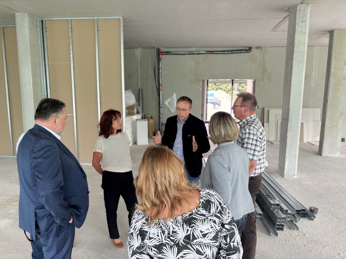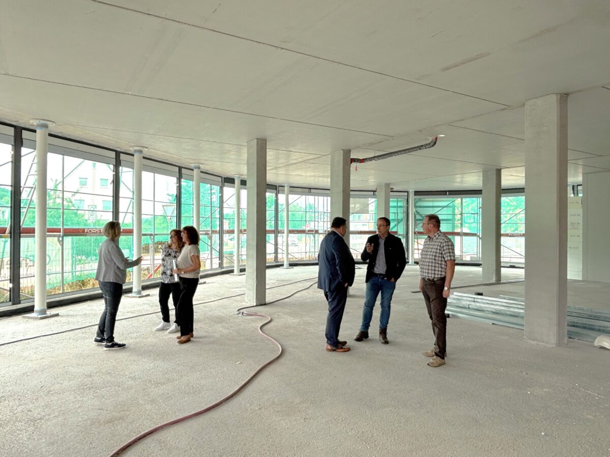 Der Bau der neuen Stadtbücherei in der Regensburger Straße schreitet sichtbar voran. Bei einer Baustellenbesichtigung konnten sich Bürgermeister Thomas Beer, Kämmerer Georg Beer, Bauunternehmer Georg Ehrenreich sowie das Bücherei-Team ein Bild vom aktuellen Stand der Bauarbeiten machen. Die Arbeiten schreiten planmäßig voran.