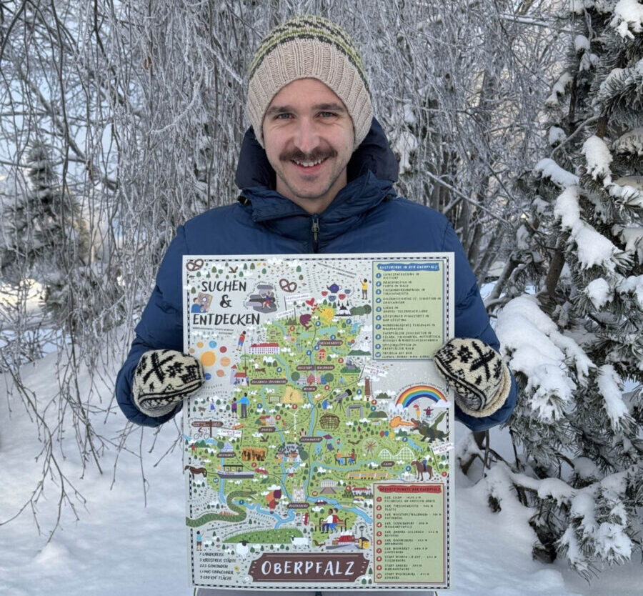 Obwohl Fabian Neugirg heute mit seiner Familie im schwedischen Strömsund lebt, bleibt seine Verbindung zur Oberpfalz stark. Unter kpunktart entwirft er detailreiche Landkarten und kreative Produkte, die Geschichten erzählen und Heimatgefühl vermitteln. Seine Werke – darunter das beliebte Oberpfalz-Puzzle – sind bei Oberpfalz-Fans sehr gefragt.