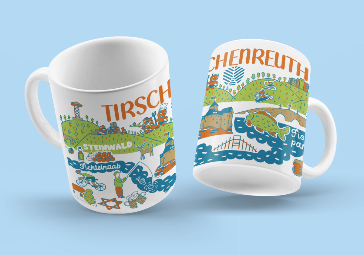 „Die Oberpfalz ist für mich weit mehr als nur ein Ort – sie ist ein Lebensgefühl“, sagt Fabian Neugirg. „Mit der Tirschenreuth-Tasse möchte ich genau dieses Gefühl einfangen: vertraute Heimat auf eine kreative und humorvolle Art erlebbar machen.“ Seine Verbundenheit mit der Region, obwohl er heute mit seiner Familie in Nordschweden lebt, spiegelt sich in jedem Detail der Gestaltung wider. Auch die Farbwahl ist von der Region inspiriert: Zoigl-Braun erinnert an die Gemütlichkeit der Zoiglstuben, Teich-Blau steht für das glitzernde Wasser des „Landes der 1000 Teiche“ und Fichtengrün symbolisiert die dichten Wälder des Oberpfälzer und Steinwaldes.