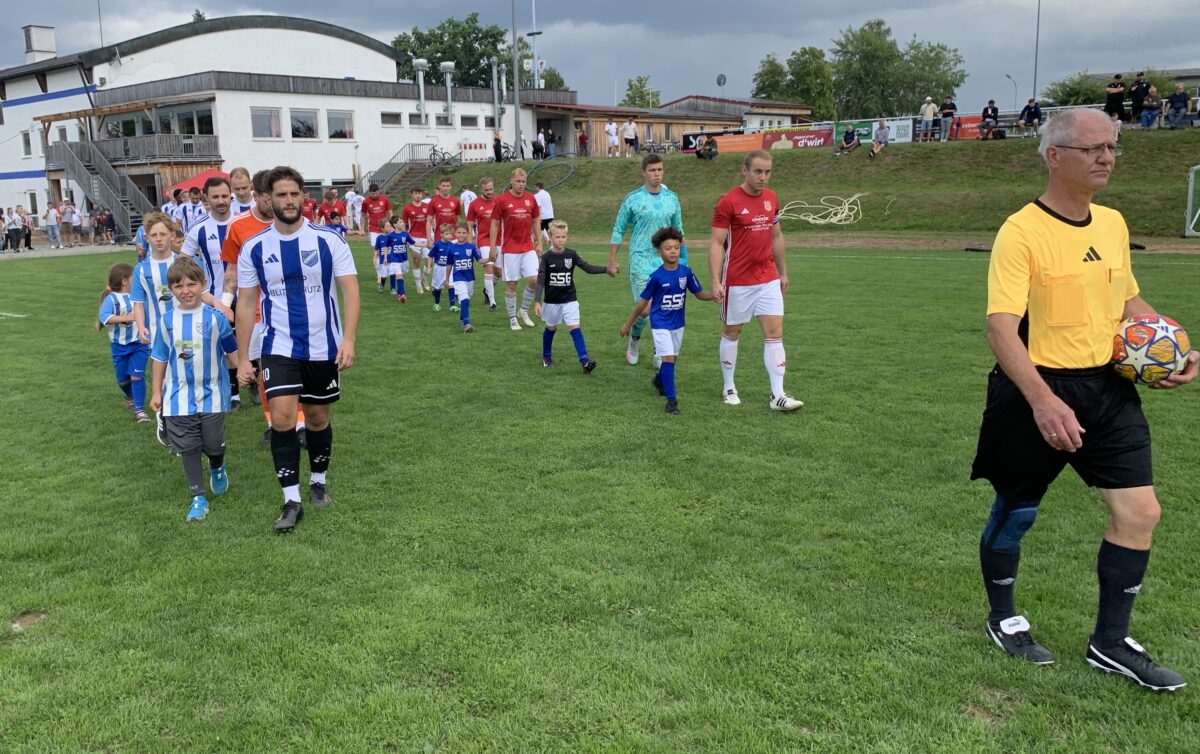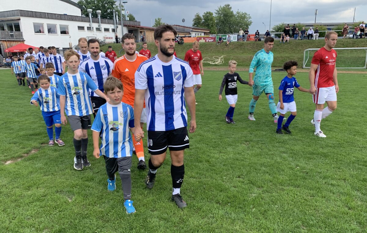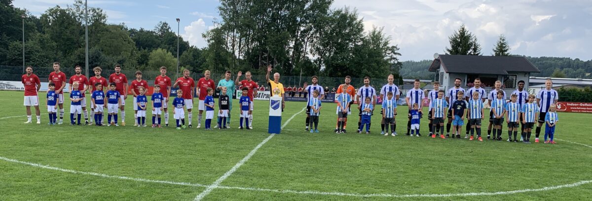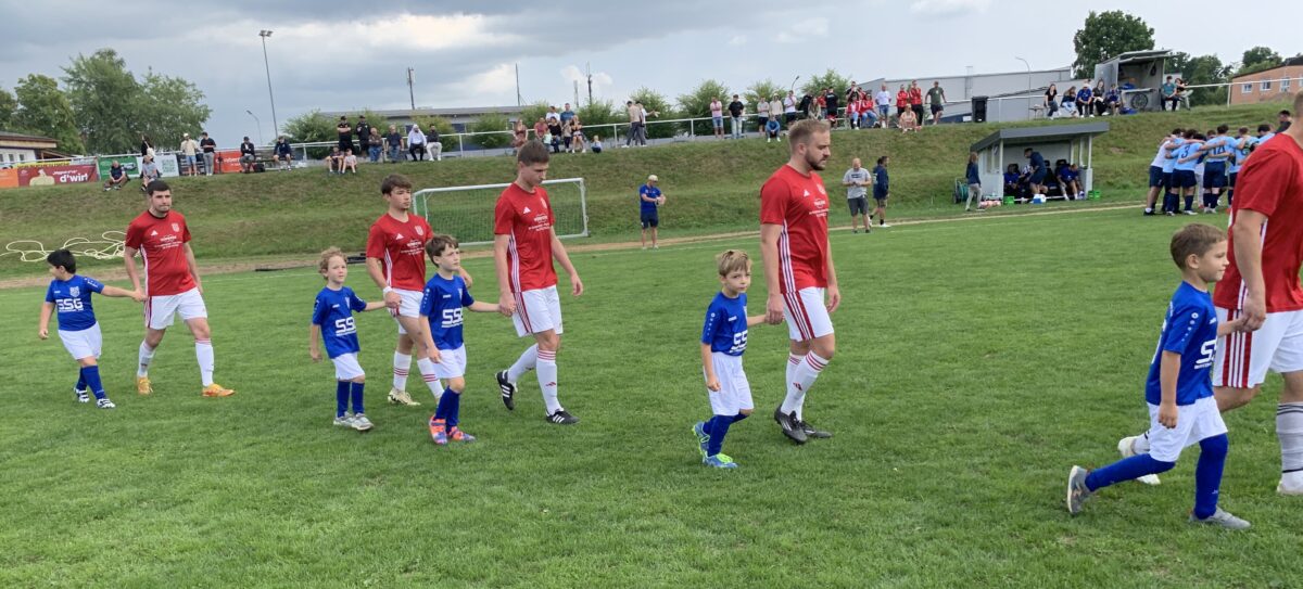 Ein Dankeschön für ihren Einsatz und Freude bereiteten die Betreuer Thorsten Schramm und Jochen Kraemer den Nachwuchsfußballer der E- und G-Junioren ein tolles Erlebnis zu bereiten. Beim ersten Saisonspiel der 1. Mannschaft durften die Kinder mit den Spielern ins Feld einlaufen. An den Händen der Spieler den Heimmannschaft und der Gäste aus Pleystein durften die Kids den Platz betreten. Ein gemeinsames Foto mit den Mannschaften im Mittelkreis rundete das tolle Erlebnis für die Kinder ab.