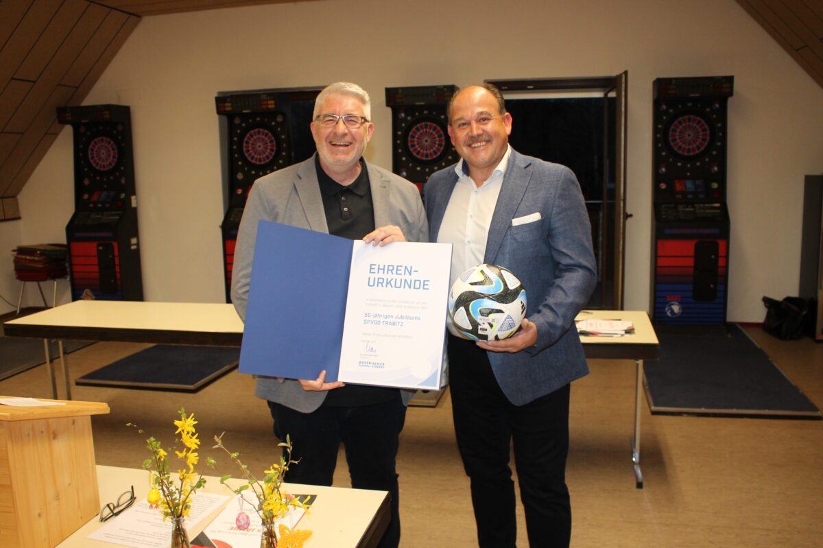 Bürgermeisterin Carmen Pepiuk lobte die generationen- und völkerverbindende Integrationskraft des Vereins als „Ort der Begegnung“, und Thomas Graml, Bezirksvorsitzender des Bayerischen Fußballverbands (BFV), den „klaren Blick in die Zukunft“, der sich in der umfassenden Modernisierung des Sportgeländes manifestiere. Wie Pepiuk würdigte Graml den Sport als „Kitt der Gesellschaft“ und unterstrich dessen Bedeutung als Instrument der Erziehung zu „Fair Play, Kameradschaft, Integration, Umgang mit Niederlagen und Zusammenhalt in Verein und Gesellschaft“. Nicht zuletzt für die Bedeutung des Trabitzer Sportvereins als „Leuchtturm der Integrationsarbeit“ übergab Graml eine Ehrenurkunde des BFV und einen Ehren-Spielball an Martin Pepiuk.