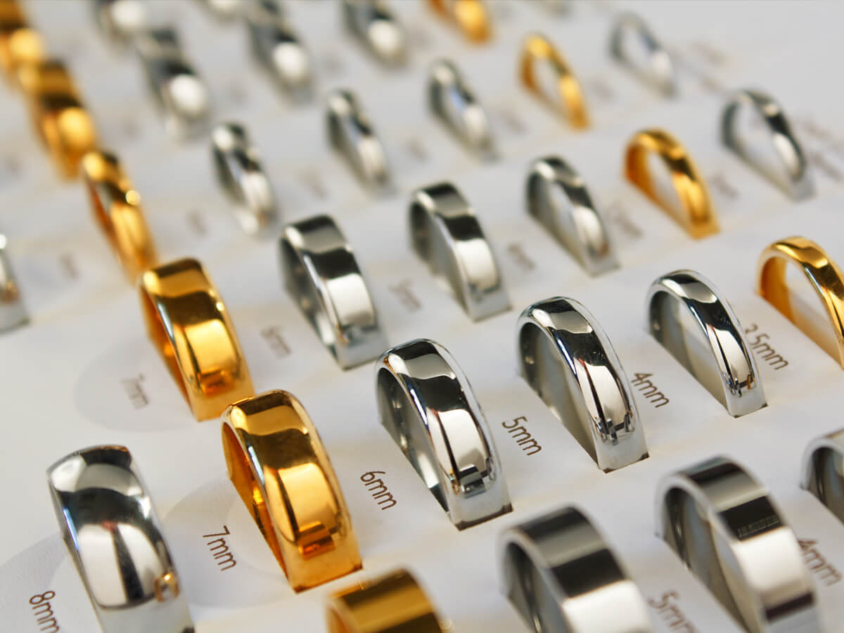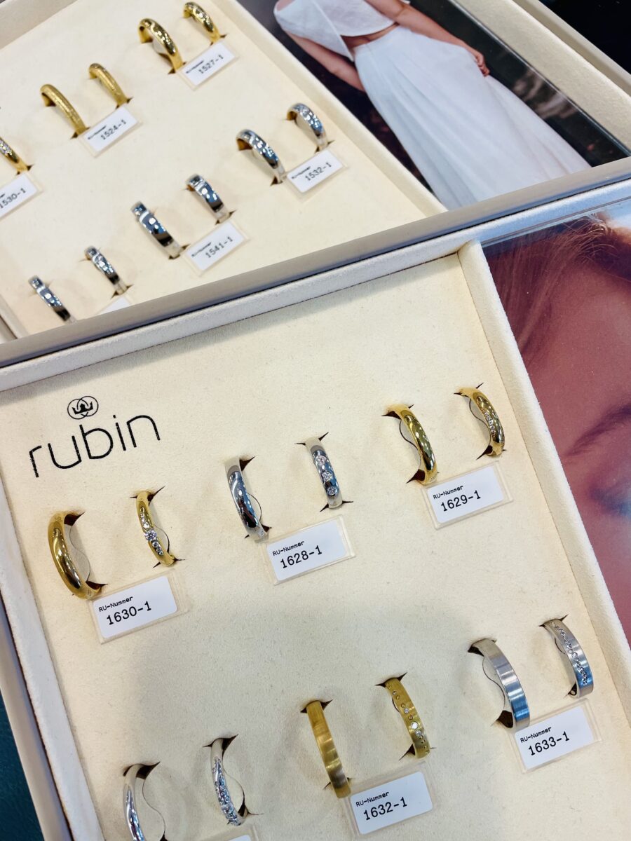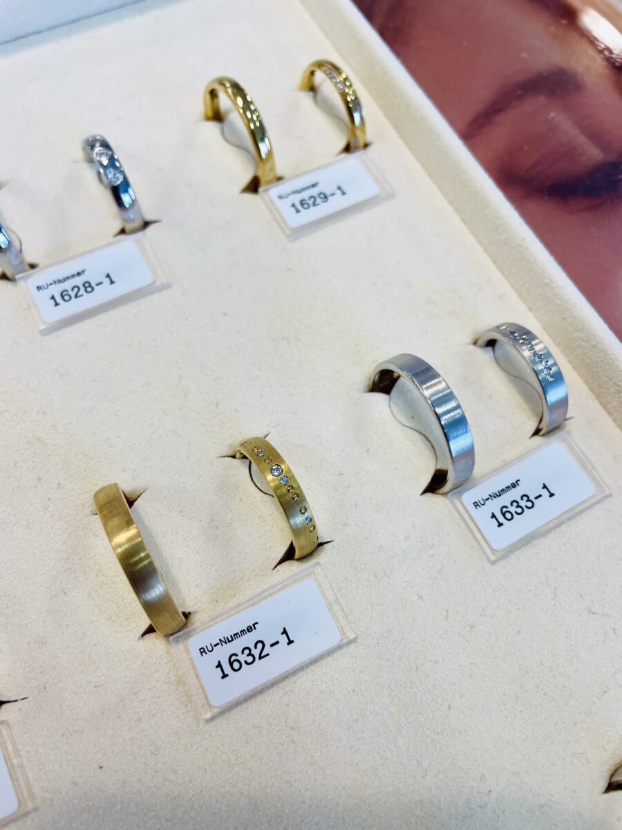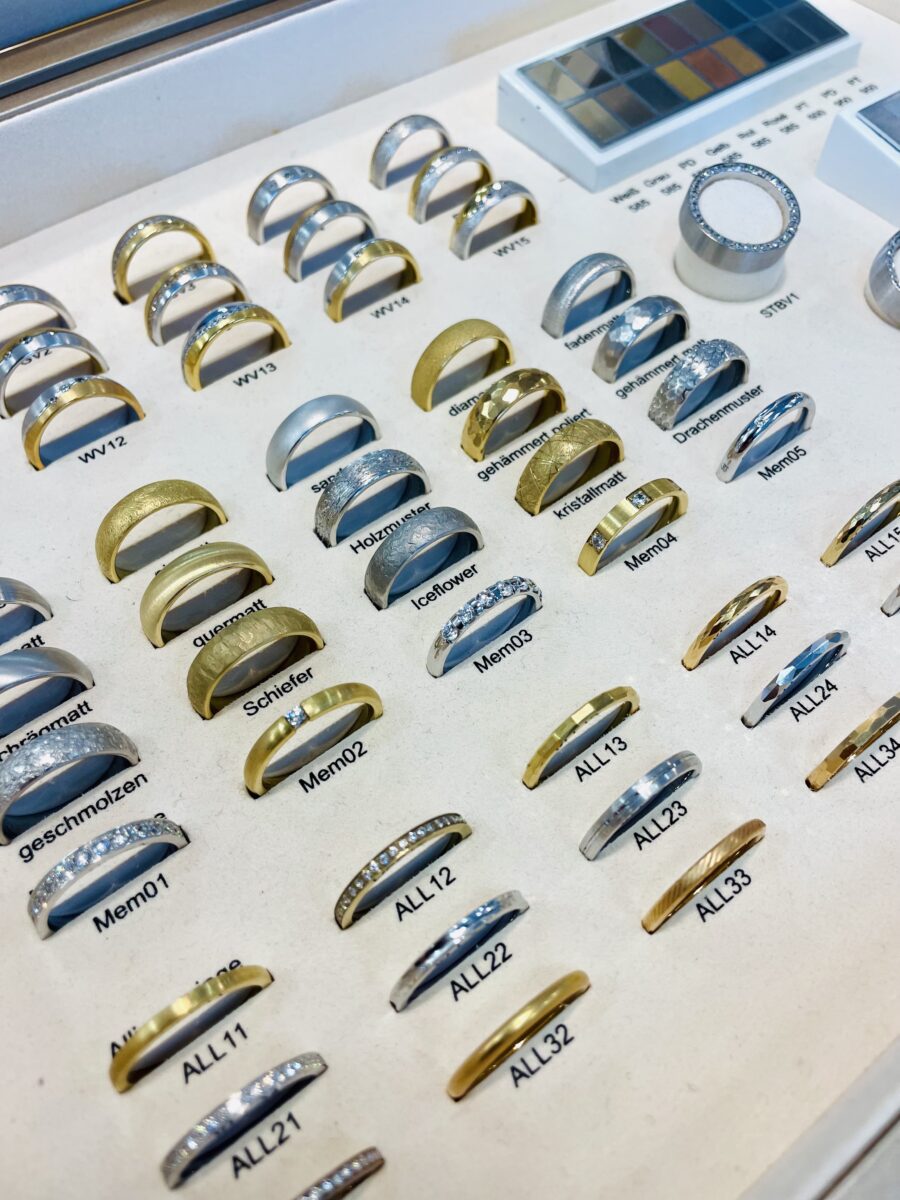 Im Geschäft befinden sich über 300 Ringe zum Ansehen und natürlich zum Probieren. Davon sind rund 100 Paar Ringe frei konfigurierbar, das heißt Ringbreite, Oberfläche, Legierung, Steinbesatz usw. können ganz frei verändert und individuell an den eigenen Geschmack angepasst werden. Damen- und Herrenring sind dabei getrennt voneinander gestaltbar, so ergebene sich tausende Möglichkeiten.