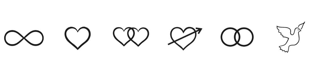 Hierfür wählen die Paare aus unterschiedlichen Elementen: Sehr beliebt sind das Unendlichkeitszeichen, ein Herz oder Doppelherz, Herzen kombiniert mit einem Pfeil, verschlungene Ringe oder die Taube, als Symbol der Verbundenheit.