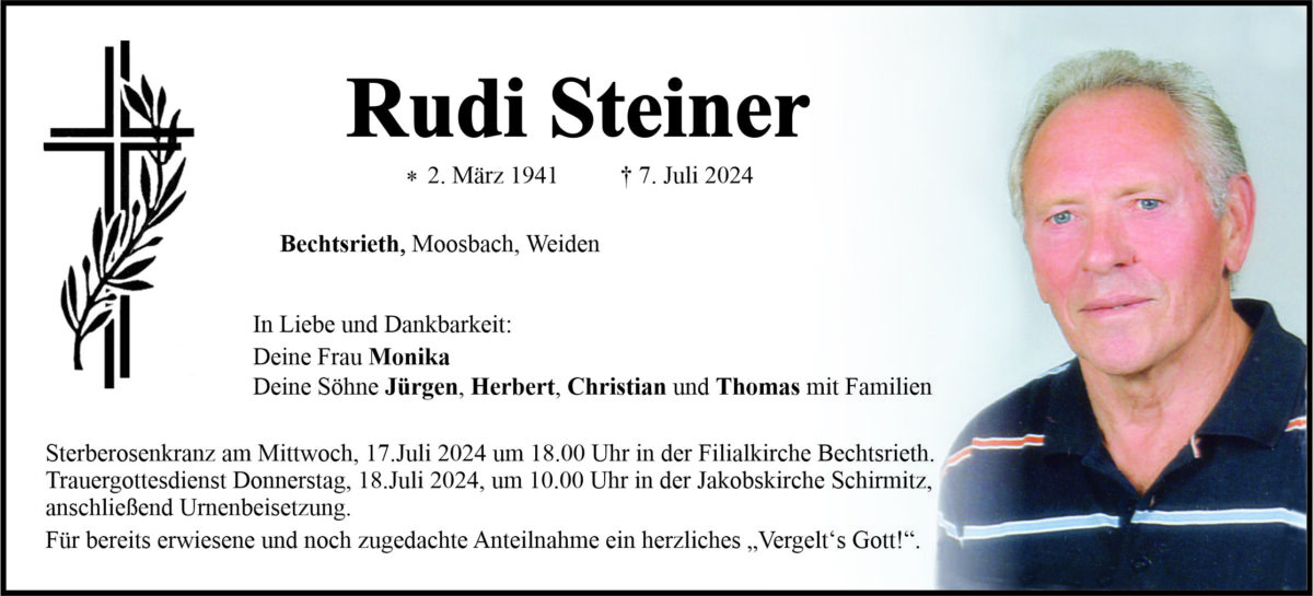 Traueranzeige Rudi Steiner, Bechtsrieht 12. Juli 2024, 20:00 Uhr Von: redaktion Begleitet durch: Bestattung Bauer - Weiden Traueranzeige Rudi Steiner, Bechtsrieht Landkreis Neustadt/WN Bechtsrieth