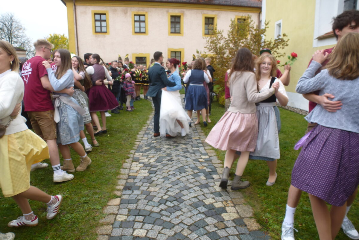 Begonnen hat ihre Liebesgeschichte auf der Freihunger Kirwa 2021. „Schon beim ersten Tanz habt ihr gemerkt: Das passt“, sagte Lehrerin Lydia Bilger, eine Bekannte des Paars aus Lindau/Bodensee, in ihrer humorvollen Ansprache. Auch eine Beziehung zwischen zwei Menschen sei wie ein Tanz, zeigte sie anhand von vier verschiedenen Schuhen und Alltagsbeispielen auf. „Ihr braucht euch gegenseitig und damit Taktgefühl, die gleichen Tanzschritte und einen guten Tanzplan für euer Leben, stark geprägt vom Hof und vom Zusammenleben mehrerer Generationen, sowie die Bereitschaft, aufeinander einzugehen, und Training im gemeinsamen Lebenstanz.“