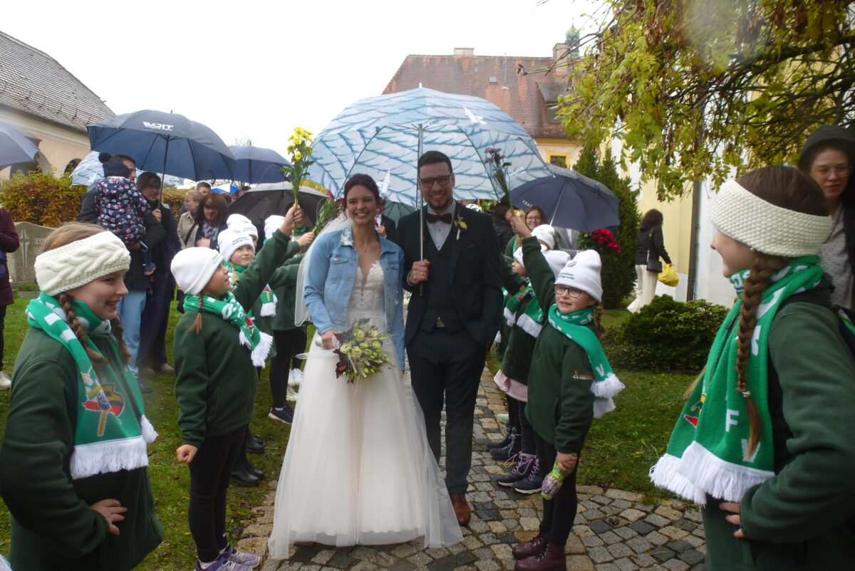 An der Hand ihres Vaters zog Alexandra ein, während zwei Freunde Rosenblüten über den Teppich und die Gäste streuten. „Ihr traut euch und vertraut euch einander an. Danken wir Gott, dass ihr beide euch gefunden habt“, sagte Pfarrer Andreas Ruhs am Samstag in der St. Dionysius-Kirche Neunkirchen zum 28-jährigen Techniker für Landbau und zur gleichaltrigen Finanzwirtin, eine geborene Luber aus Thansüß. Der Heiratsantrag erfolgte 2024 in Norwegen, die standesamtliche Trauung heuer am 25. Januar im Parksteiner Rathaus. Der Bräutigam ist im elterlichen Ferkelerzeugerbetrieb in Hammerles tätig, die Braut beim Finanzamt Weiden.