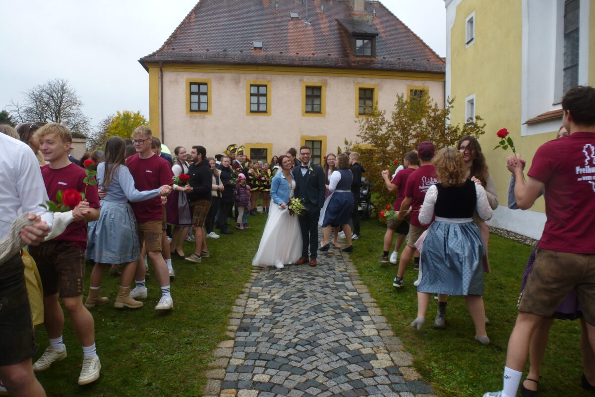 Mit einem kaum überschaubaren, farbenprächtigen Ehrenspalier gratulierten der vierfachen Tanzlehrerin der Faschingsverein Pressath mit Prinzengarde und Elferrat, die Kirwaleit aus Freihung und Kaltenbrunn, der Faschingsverein Hammerles. Angetreten waren auch die Taekwondo-Gruppe des TuS Vilseck – die Braut fungiert dort als Spartenleiterin und Trainerin – sowie die KLJB Schwarzenbach, wo Stefan Mitglied ist.
