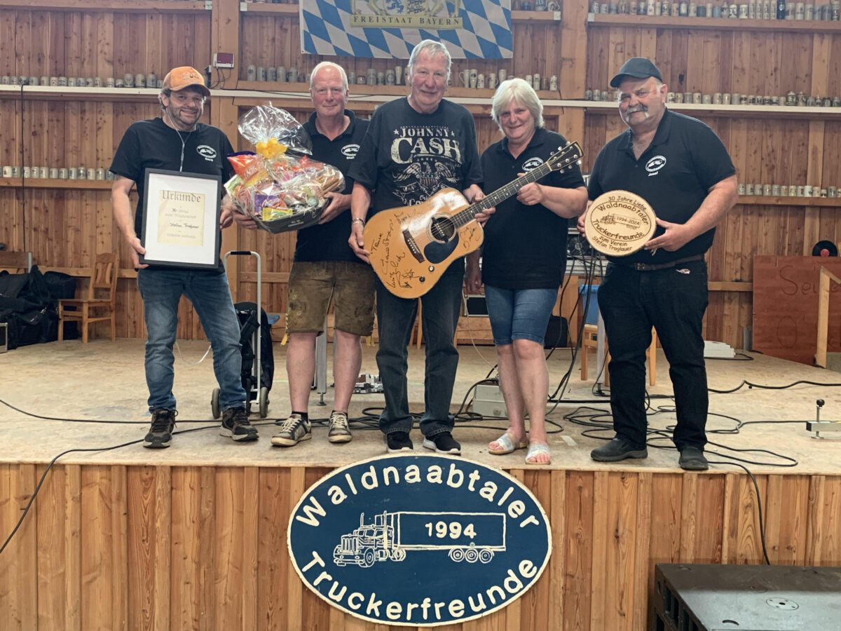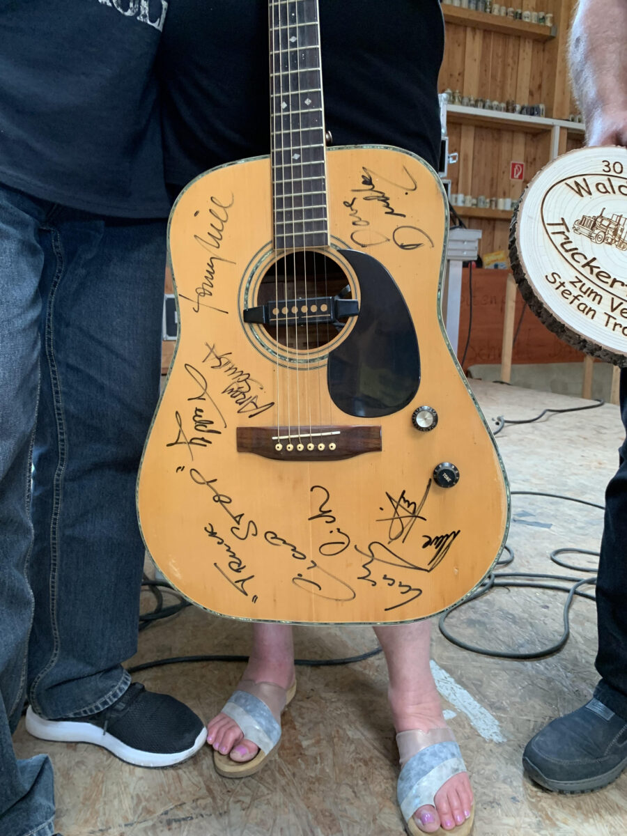 Des Weiteren überraschte Bernd Halpick, alias „Country-Bernd“ aus Etzenricht die Verantwortlichen mit einem Jubiläumsgeschenk. Er war langjähriger Gitarrist bei den Truckertreffen in der Vergangenheit. Seine Gitarre ist original signiert von folgenden Musikhelden der Country-Szene: Jonny Hill, Dave Dudley, Larry Schuba sowie von der kompletten Band der ehemaligen Ur-Truckstop-Truppe. Sepp Wachter versprach sofort, dass die Gitarre einen Ehrenplatz im Verein bekommen wird.