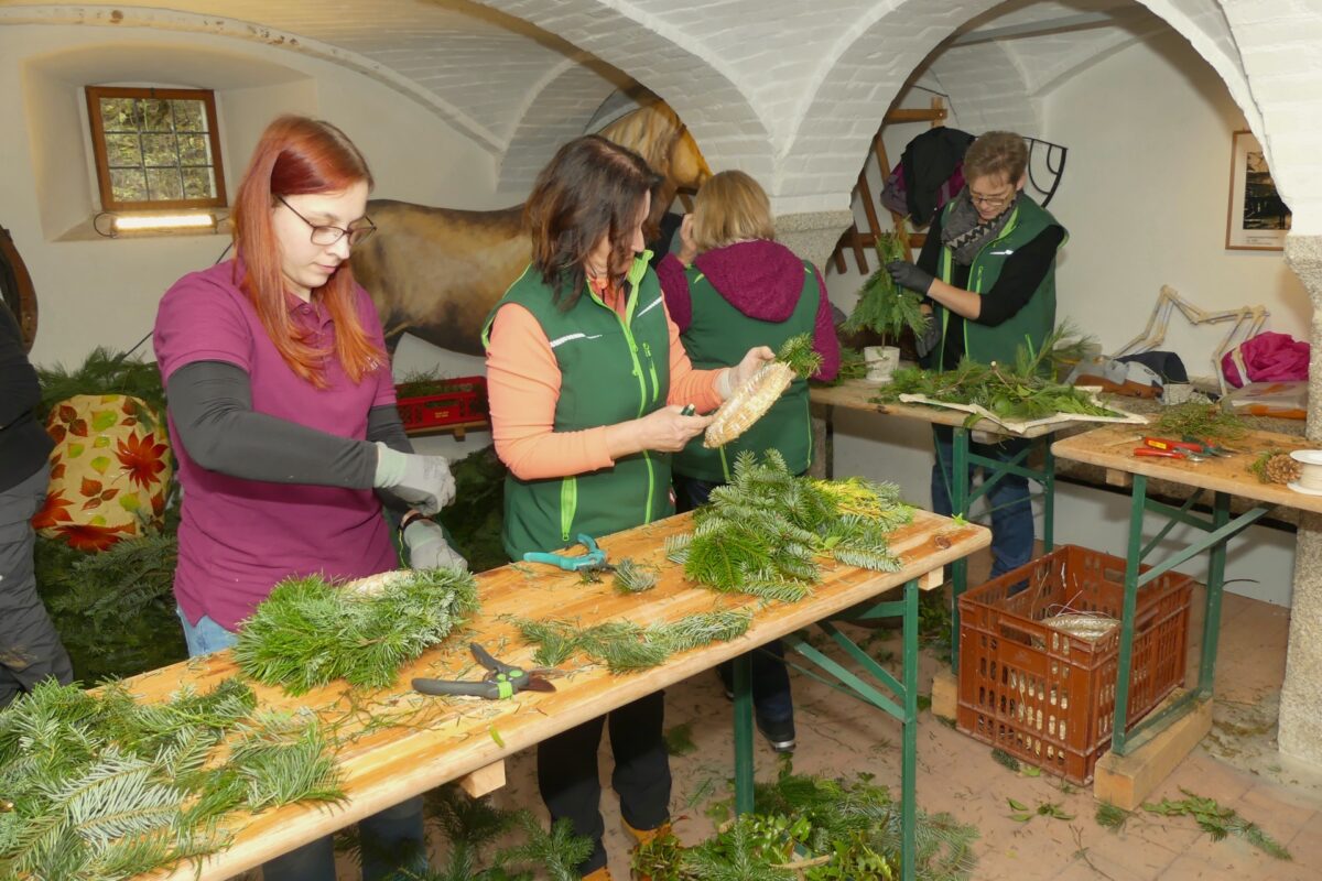 Natürlich durfte bei einem Wintermarkt das Adventskranzbinden nicht fehlen. Es fand im Stall des Denkenbauernhofs statt und wurde von Mitgliedern des Gartenbauvereins Neusath durchgeführt. Viele Besucher beließen es nicht beim Zuschauen, sondern nahmen gleich einen fertigen Adventskranz mit. Nebenan in der Stube bot Edeltraud Schafhauser aus Luhe-Wildenau ihren hausgemachten Kümmellikör an. Das ganz Besondere daran ist, dass der Kümmel in der Oberpfalz angebaut wird, nämlich in der Gegend um Kulmain. Auch die Tiere, die ständig im Museum leben, genossen den schönen Tag. Sie sind es ja gewohnt, täglich besucht und bewundert zu werden und ließen sich deswegen von der großen Zahl an Kindern nicht aus der Ruhe bringen.