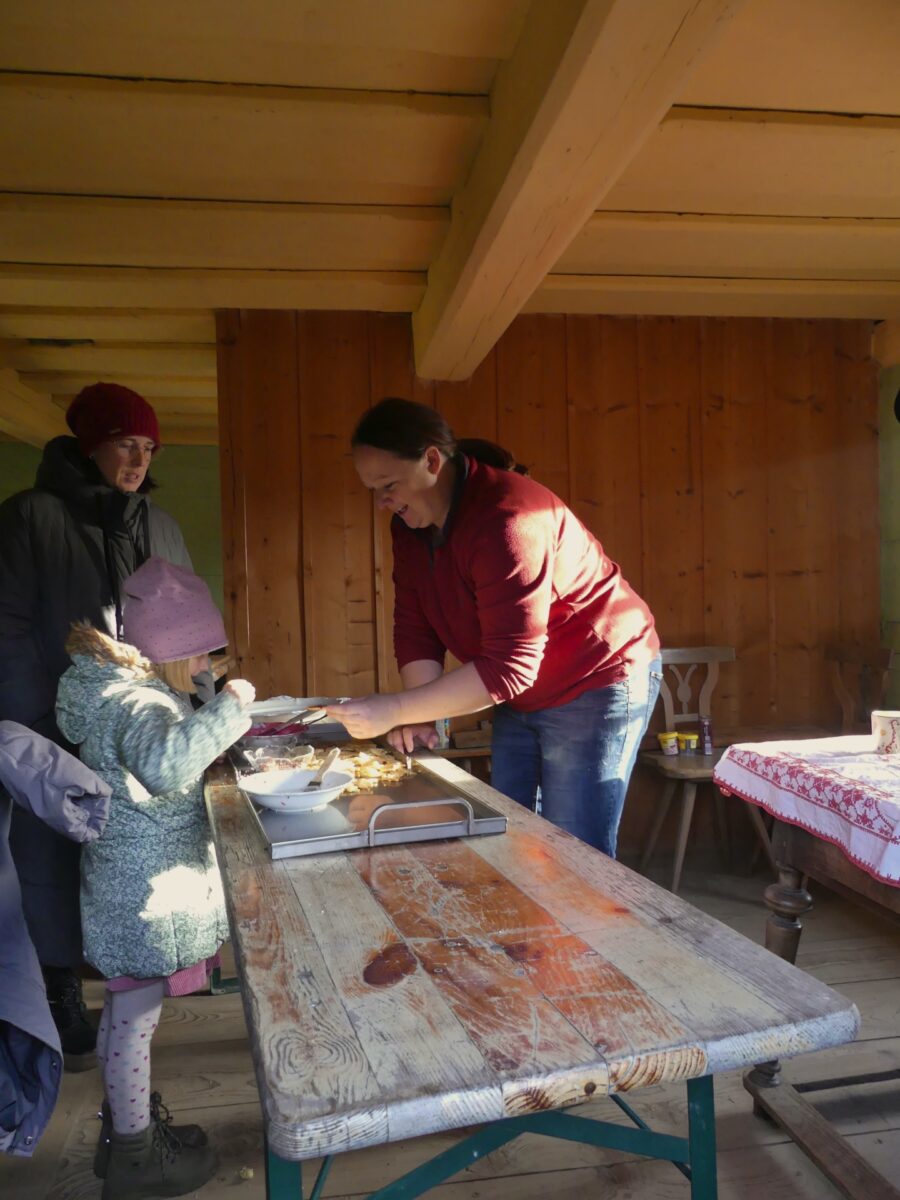 Dazu gab es im Köslerwenzel frisches Gebäck und Getränke, während im Bereich der Chaussee die beiden Gästeführerinnen Irene und Kerstin Ehemann Teig für Stockbrote hergerichtet hatten, welche von den Kindern über dem Lagerfeuer gebacken werden konnten. Es war keine große Überraschung, dass die beiden zeitweise mit der Ausgabe neuer Stöcke bremsen mussten, weil kein Platz mehr über dem Feuer war. Diese Aktion fand in diesem Jahr zum zweiten Mal statt und war auch 2023 bereits der absolute Renner gewesen.