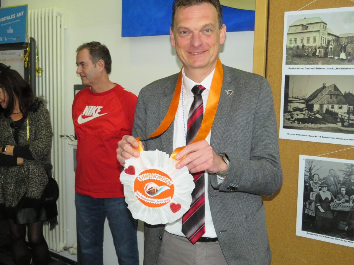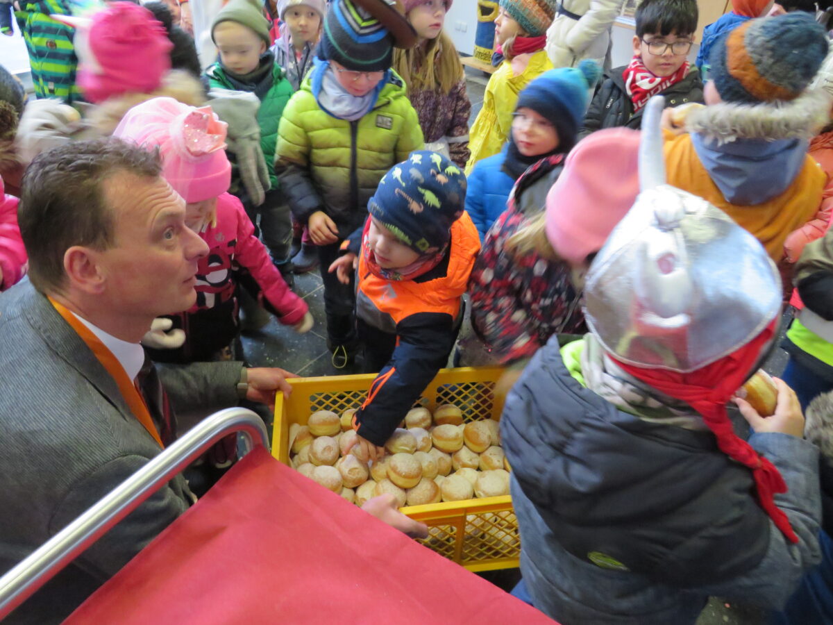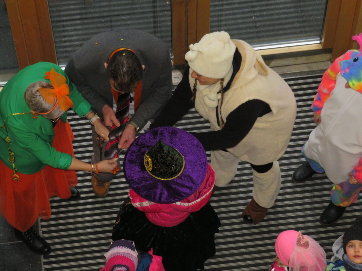 An der Krawatte von Ernst Schicketanz wurde die Schere angesetzt. Laut ging es bei der vom Bürgermeister anführten Polonäse durch die Gänge des Rathauses. Mit dem Ehrenorden des Kindergartens zeichneten die Faschingsgesellschaft das Gemeindeoberhaut aus. Zur Belohnung für den Besuch erhielten die Kids süße Faschingskrapfen.