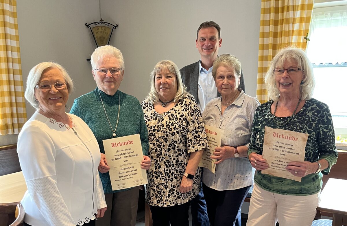 Mit Urkunden zeichnete Vorsitzende Karin Neumann fünf Mitglieder für ihre Treue zum Ortsverein der Arbeiterwohlfahrt Altenstadt im Vereinsheim von Beyer & Co aus. Bürgermeister Ernst Schicketanz lobte die Treue der Mitglieder. Diese Treue ist die Basis für das Bestehen des Vereins.