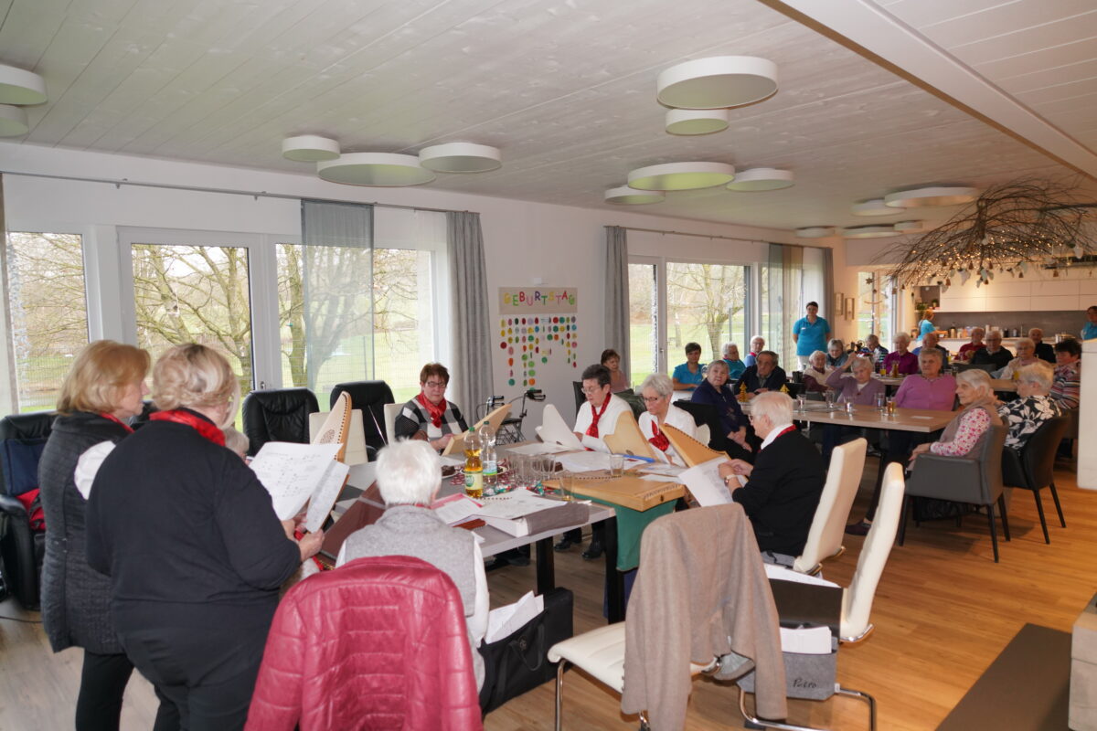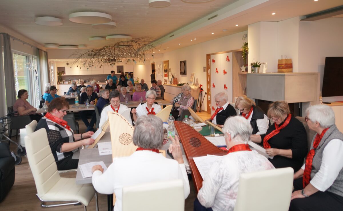 Die neun Frauen rückten die Stühle zurecht, sie schoben die Notenblätter unter die Saiten und brachten konzentriert die Finger in Position. Vermutlich waren einige Tagespflegebesucher dabei, die bisher ein solches Instrument noch nicht kannten. Der beruhigende Klang, kombiniert mit dem Gesang erfüllte die schönen Räumlichkeiten der Tagespflege mit Blick durch die großen Fenster zum Waldthurner Badeweiher.