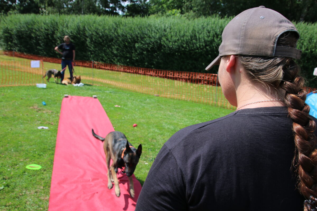 Auf dem roten Teppich musste der Hund auf ein Kommando warten und durfte erst los, wenn sein Herrchen ihn rief. Beim Dosenwerfen ging es um Treffsicherheit und die Ruhe des Tieres. Und auf einer Rampe musste es ohne Makel darüber laufen und aus einem kleinen Wasserbecken Bälle apportieren. Mitglieder des Vereins bewerteten als Jury die Leistungen.
