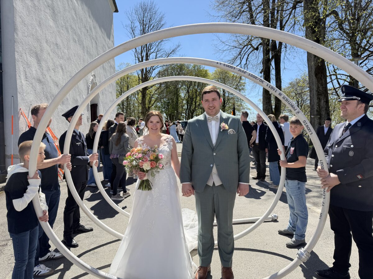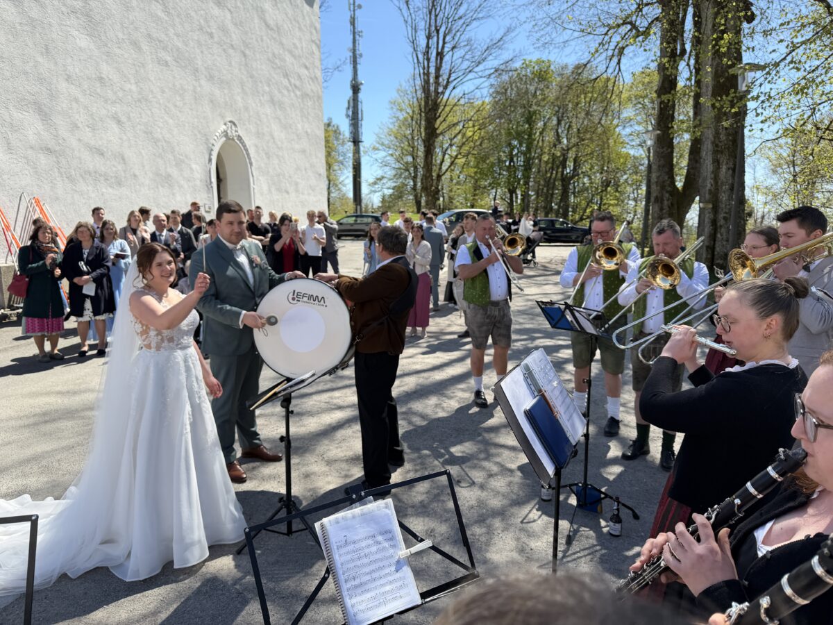 Am Kirchenportal stand schließlich bei herrlichsten Sonnenschein eine unglaubliche Menge an Gratulanten. Neben den Musikerfreunden und -freundinnen war die Waldthurner Landjugend, bei denen beide seit vielen Jahre Mitglied sind, aufmarschiert. Die hübsche Braut ist bei der Kolpingsfamilie Waldthurn, die natürlich ebenfalls gekommen war. Hannah ist auch Fan des 1. FC Nürnberg, wobei hier vermutlich der leider verstorbenen Opa Heinz Bergmann, ein intensiver Clubberer, durchgeschlagen hat. Der Waldthurner Fan-Club war gekommen, um Hannah und Felix zu gratulieren. Felix Griesbach ist auch Mitglied bei der Lennesriether Feuerwehr und bei den Seilziehern der Fahrenbergauswahl, die herzlich gratulierten. Auch Arbeitskollegen vom Amt für Ländliche Entwicklung fehlten nicht. Die Schlossberger und Waldthurner Kapellen spielten auf und Amicanti brachte dem Paar ein Ständchen.