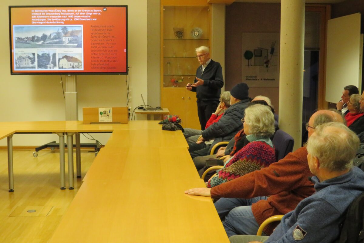 Bürgermeister Ernst Schicketanz und Arbeitsgemeinschaftsleiter Leiter Rainer Christoph freuten sich über den guten Besuch im vollen Rathaussaal. Mithilfe einer Powerpoint-Präsentation erzählte Rainer Christoph die Geschichte des Dorfes. Im böhmischen Wald (Cesky les), der auf bayerischer Seite Oberpfälzer Wald heißt, lag die Streusiedlung Paulusbrunn. Kirche, drei Schulhäuser, Wirtshäuser, Postamt und kleine Geschäfte – ein intaktes Dorfleben war garantiert.