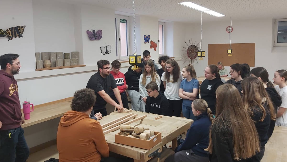 Im Rahmen der Berufsorientierung besuchte die Firma Roth aus Wunsiedel die Klasse M8. Die Schülerinnen und Schüler durften einen Tag lang im Werkraum der Schule mit einem Azubi und einem Bauleiter ihre Fähigkeiten in diesem Berufsfeld unter Beweis stellen. In Kleingruppen bauten sie einen „Zimmererknoten“. Einen ganzen Vormittag lang verbrachten die Jugendlichen mit Ausmessen, Feilen und Sägen. Am Ende konnte jede Gruppe das Knobelspiel ausprobieren und als Erinnerungsstück behalten.