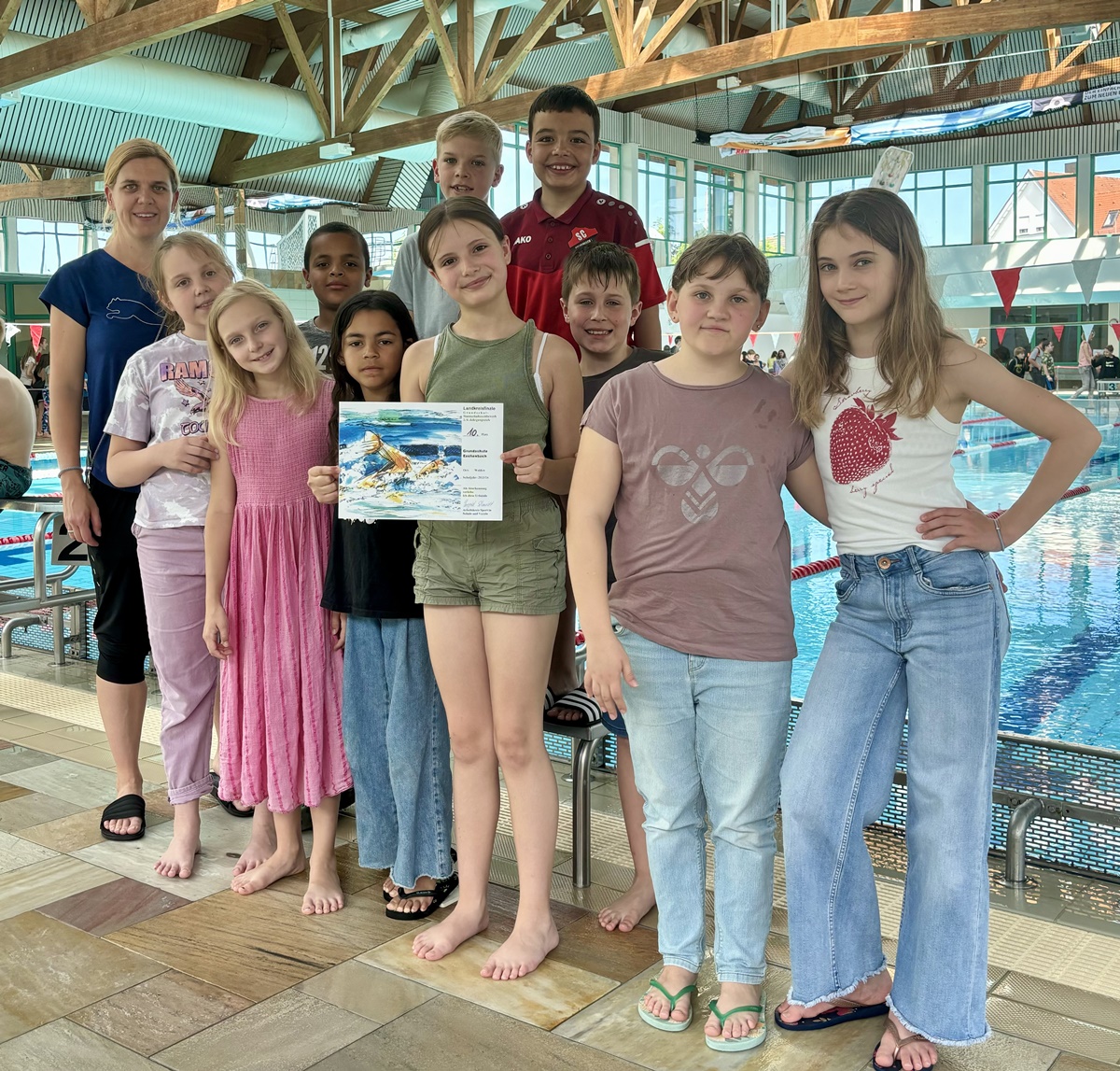 Am Mittwoch, den 15. Mai, wurde das Hallenbad Weiden zum Schauplatz eines aufregenden Wettkampfs, als Grundschulen aus dem Schulamtsbezirk Neustadt an der Waldnaab zum Schwimmwettbewerb antraten. Unter der Leitung der Lehrkräfte Pamela Walberer und Carmen Hoffmann nahmen elf talentierte Schülerinnen und Schüler der Klassen 3 bis 4 der Markus Gottwalt Schule Eschenbach an diesem spannenden Event teil. In verschiedenen Schwimmdisziplinen stellten sich unsere Athleten mutig ihren Gegnern und erzielten am Ende des Vormittages den 10. Platz.
