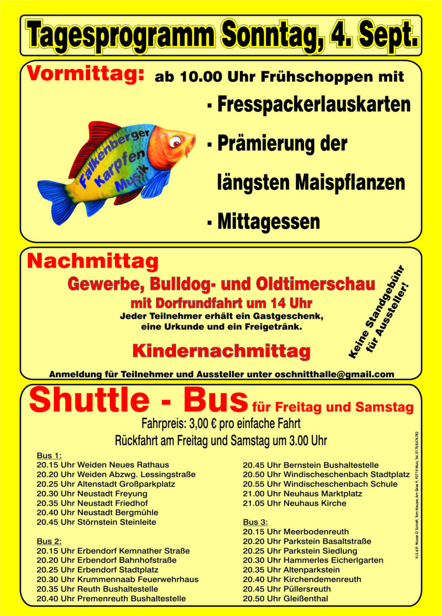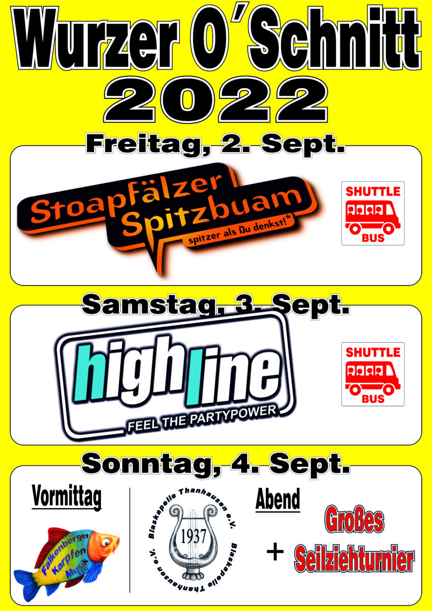 Auch dieses Jahr werden beim Wurzer O`Schnitt am Freitag und Samstag wieder Shuttle-Busse eingesetzt. Mit den „Stoapfälzer Spitzbuam“, „Highline“, „Falkenberger Karpfenmusik“ und der „Blaskapelle Thanhausen“ konnte wieder ein abwechslungsreiches und vielfältiges Programm zusammengestellt werden.