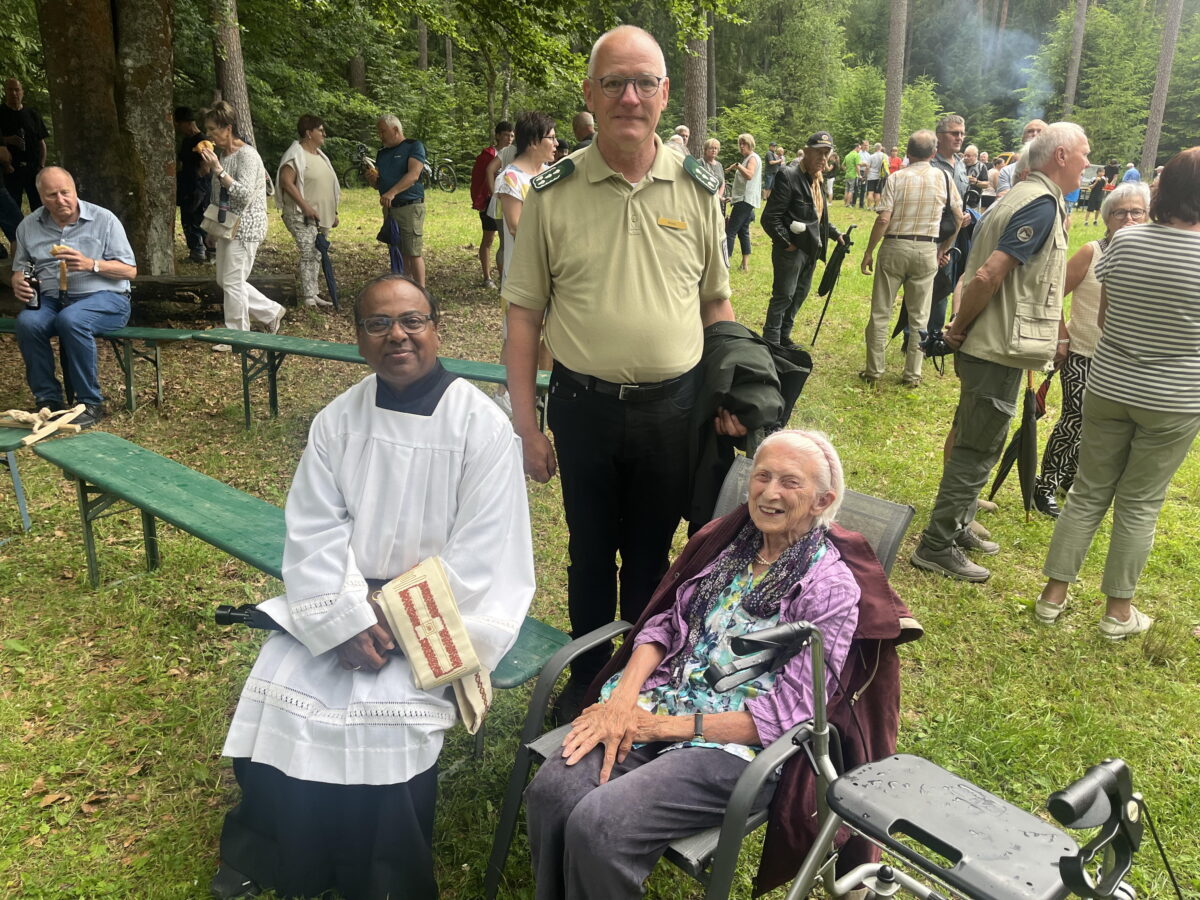 Forstdirektor Alexander Krone dankte auch im Namen seines Revierförsters Frank Gerstenmeier, dass die Tradition der Wallfahrt aufrechterhalten wird. Die Mitarbeiter des Bundesforstbetriebs sorgen auch für die Pflege des kleinen Kirchleins. Nach der Wallfahrt bewirteten sie die Pilger, die trotz des regnerischen Wetters noch gerne in schönen Natur des Sperrgebiets zu Gesprächen zusammenstanden. Älteste Teilnehmerin der Wallfahrt war die 90jährige Ottilie Gebardt aus Vilseck. Sie wurde 1935 im Erzhäusl, einem ehemaligen Forst- und Gasthaus nahe der Kapelle im Übungsplatz geboren. Gerne gab sie die Erinnerung und Erzählungen an ihren Geburtsort, dem Erzhäusl weiter.