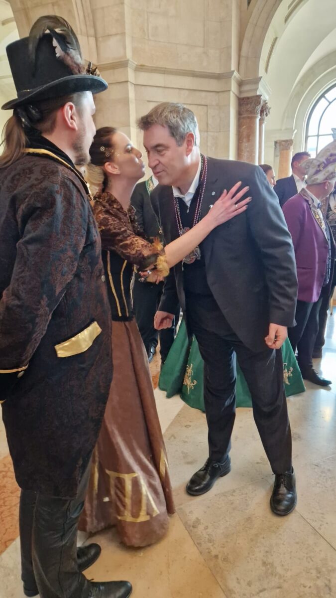 Nach kurzem Aufenthalt in der Kantine der Staatskanzlei wird die närrische Gesellschaft in die große Empfangshalle mit wuchtiger Kuppel gebeten. Die kurze Wartezeit wird durch lautstarke musikalische Darbietungen der „Günzburger Blechbätsch’r“ begleitet. Dann betritt Markus Söder um 11:45 Uhr die Halle. Der Ministerpräsident, der kurz zuvor noch am Flughafen war, an dem er die zur Sicherheitskonferenz angereiste US-Vizepräsidentin Kamala Harris empfangen hatte, begrüßt die anwesenden Abordnungen und bedankt sich für das geduldige Warten.