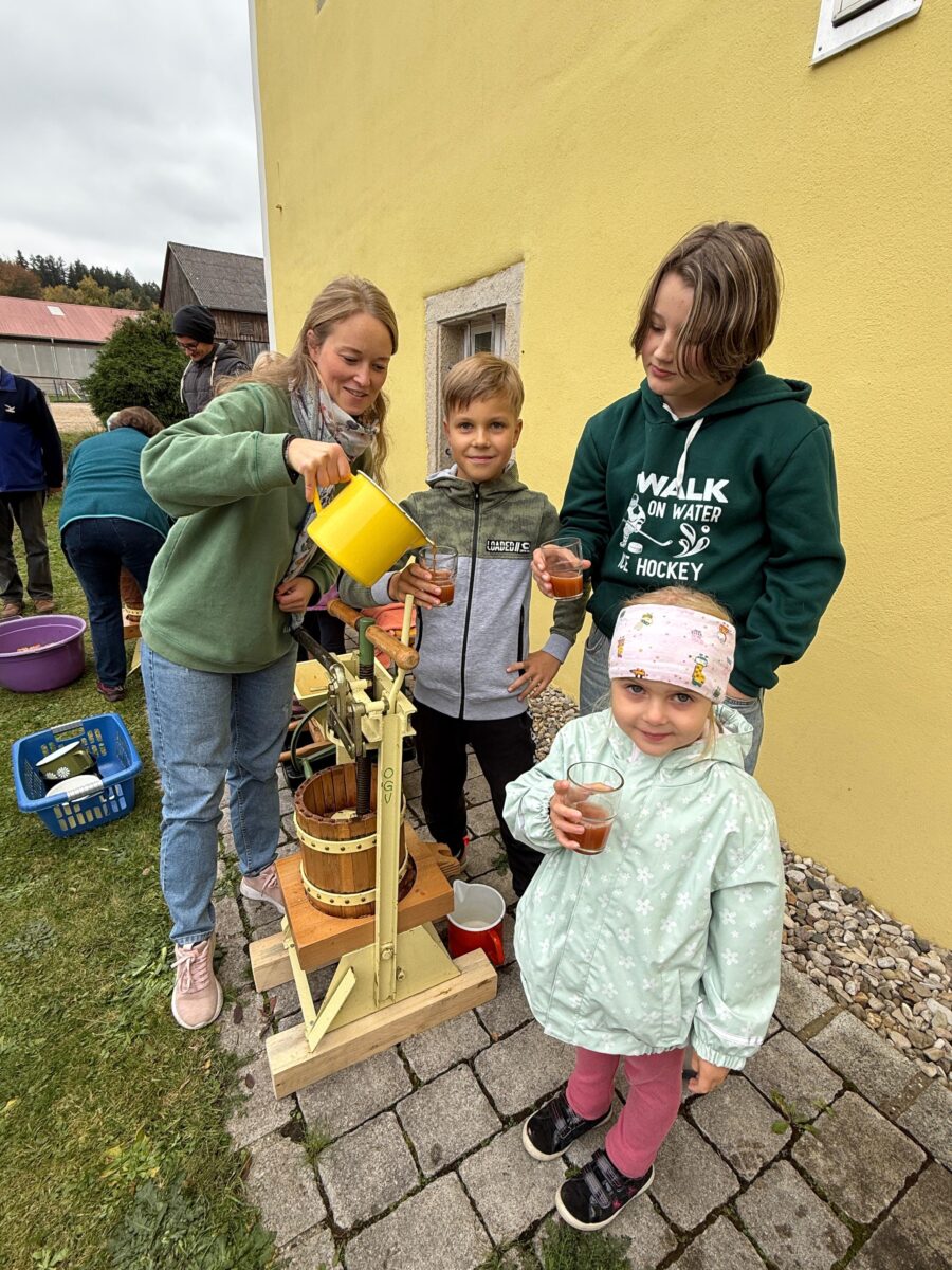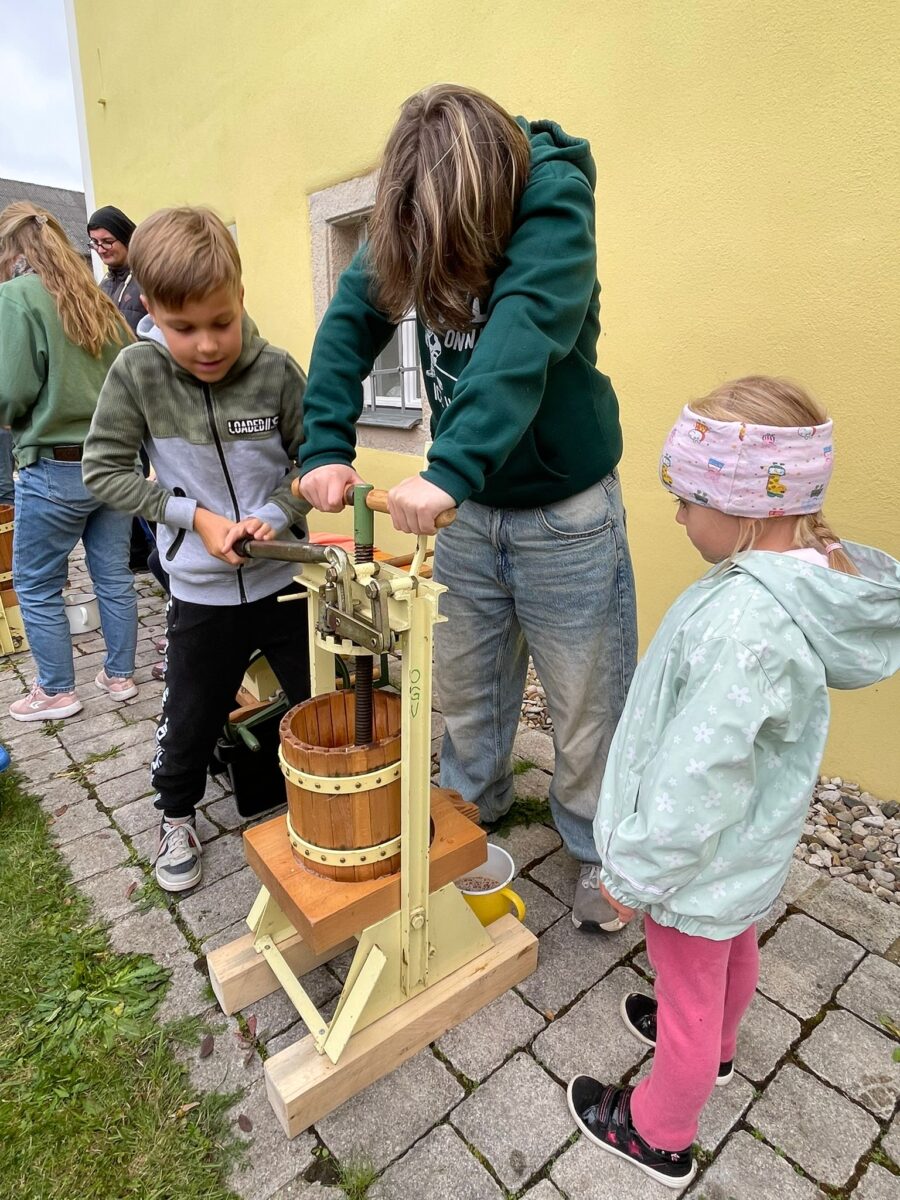 Unter der Leitung von Carola Matthies und ihrem Team wurde an der Hütte hinter der Pfarrkirche „Mariä Himmelfahrt“ eifrig mit viel Spaß und Teamgeist gewaschen, ausgeschnitten, zerkleinert und gepresst. Die angelieferten rotbackigen und gelben Äpfel stammten vom Obstlehrpfad, aber auch aus privaten Gärten. So entstanden mit zwei Obstpressen und einem Schnitzelwerk rund 15 Liter frisch gepresster Apfelsaft, der direkt in Flaschen abgefüllt, mit nach Hause genommen werden konnte. Natürlich wurde das goldene, flüssige Vitamin C schon vorher probiert.