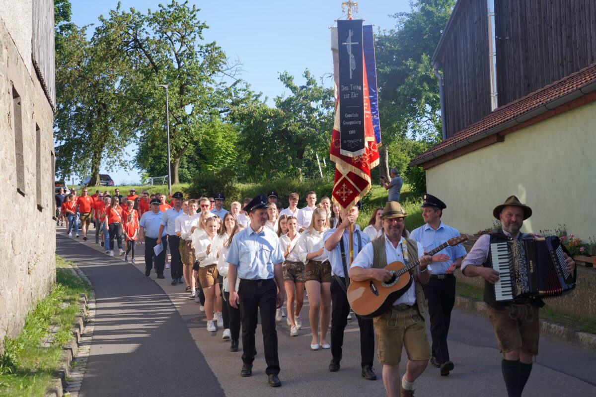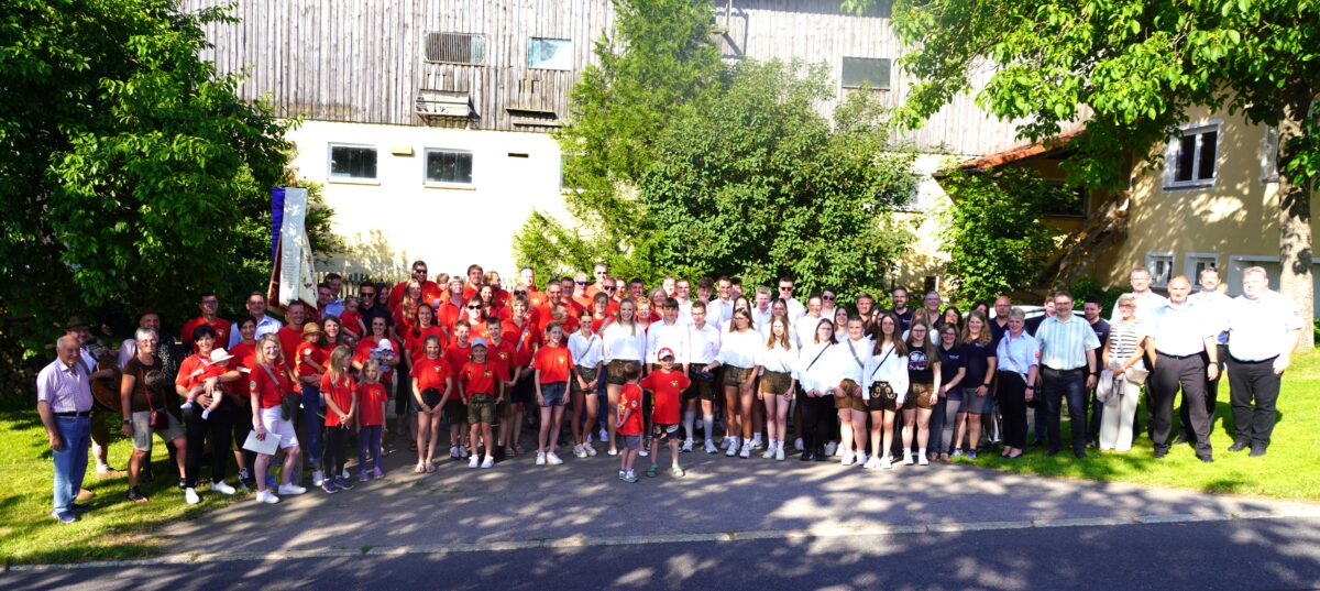 Am Dorfeingang von Spielberg – beim Wirtsheiner – nahmen die Neudorfer zusammen mit ihren Freunden von der Feuerwehr Altenhammer Aufstellung und Schwung. Pünktlich am Samstagabend um „Sechse“ marschierten sie unter den Klängen der „vom Grenzland mitgebrachten“ Mittelberg-Musikanten in die Dorfmitte, zuversichtlich, aber trotzdem etwas aufgeregt, ob die Spielberger ihrer Bitte, die Patenschaft für ihr Jubiläum annehmen würden.