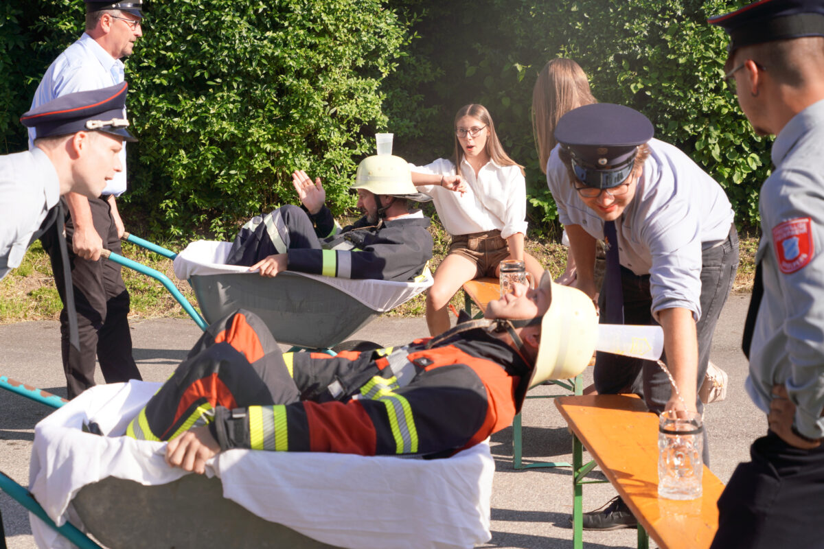Schließlich ging es zum Showdown und die Spielberger hatten sich ein sehr unterhaltsames Spiel einfallen lassen: Für besondere Heiterkeit sorgte ein Wettbewerb mit Schubkarren, Helmen. Für Spielberg fuhr Andreas „Schneidi“ Schmid einen Schubkarren, in dem Josef „Seppe“ Stangl samt Einsatzanzug und Feuerwehrhelm mit einem aufmontierten Becher saß. Das gleiche Spiel ging an die Neudorfer, es fuhr Markus Zetzl und Alexander Pilfusek musste mit dem Becher ebenfalls einen Maßkrug befüllen. Der Spaß war groß – die Abkühlung bei heißem Wetter garantiert und die Spielberger hatten im doch oft ungleichem Spiel den Krug schneller voll, was aber keinerlei Bedeutung hatte.