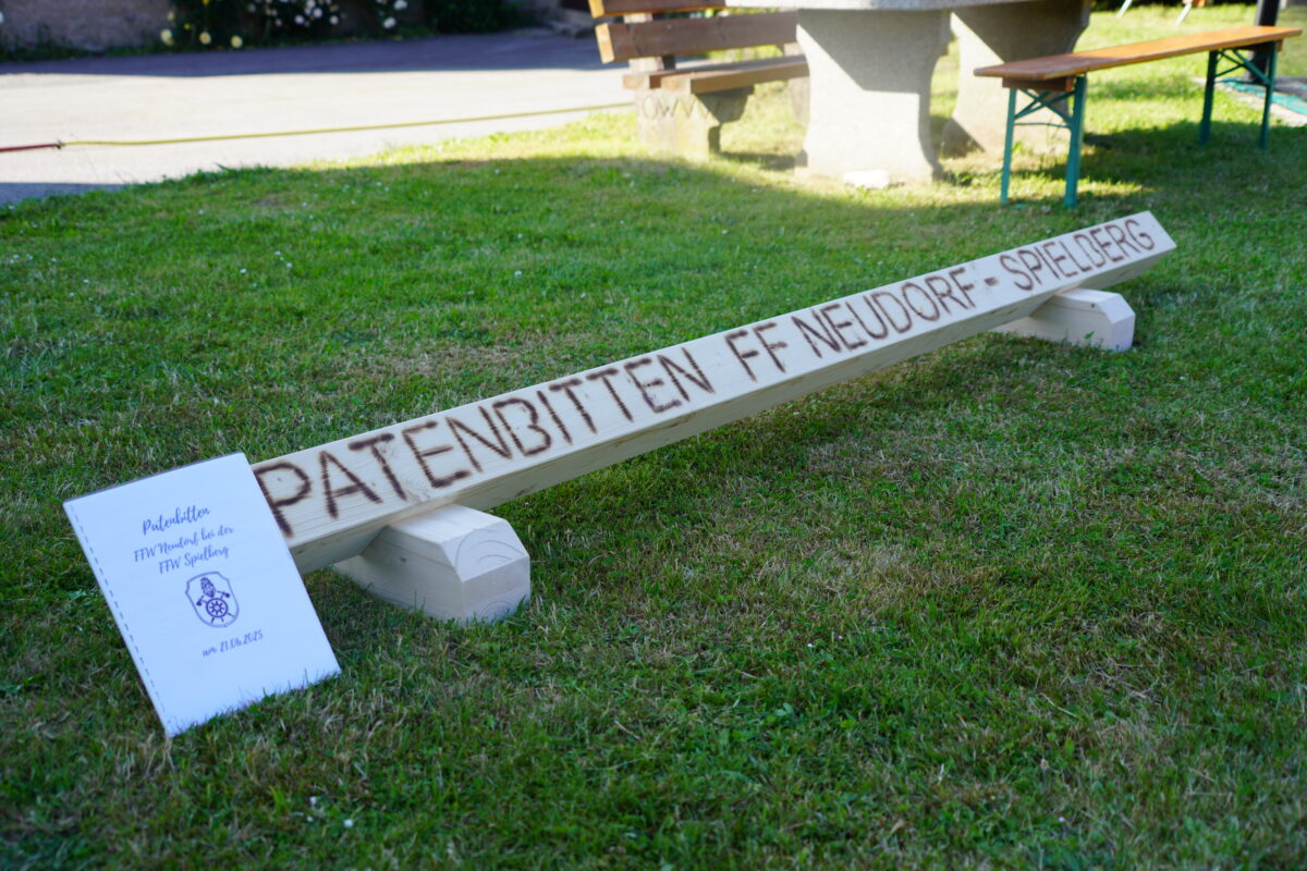 Selbstverständlich ging die Traditionsveranstaltung nicht ohne Gejammere und Knieschmerzen vonstatten und die Spielberger mussten sich hinsichtlich der Patenübernahme „etwas zieren“. So zeigten die Neudorfer sehr selbstbewusst ihr Wissen über die Feuerwehr Spielberg und bewiesen im wahrsten Sinne des Wortes mit Stolz, Herz und Witz, aus welchem Holz sie geschnitzt sind.