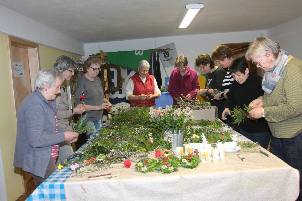 „Wir sind schon fleißig am Basteln“, lässt Leiterin Helga Essler wissen. Und so herrscht im Untergeschoss des Pfarrheims vor allem während der Woche emsiges Treiben. Die Frauen können wieder eine reichhaltige Palette anbieten. Zur Auswahl stehen vor allem Palmbüschel, – kränze, -kreuze, -ringe, -stecker oder -zweige, aber auch Osterbrote, -lämmer und -kerzen sowie Tischgestecke und Osterschmuck. Dazu kommen gefärbte Ostereier.