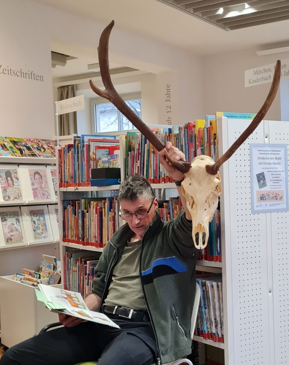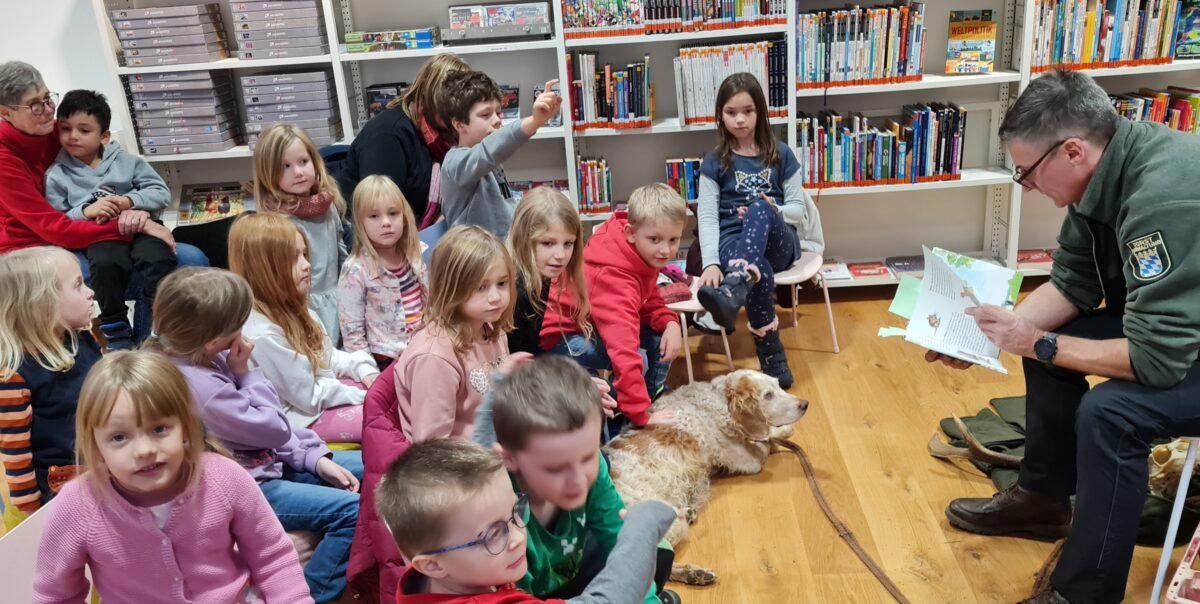 Im Rahmen des Bundesweiten Vorlesetags lud die Stadtbibliothek Eschenbach Forstamtsrat Martin Gottsche zu einer besonderen Vorlesestunde ein. Gekommen ist er nicht nur mit dem Buch “Marika und Julius: Entdecke mit uns den Wald”, sondern auch mit seinem Hund Thor, der zum heimlichen Star des Nachmittags avancierte.