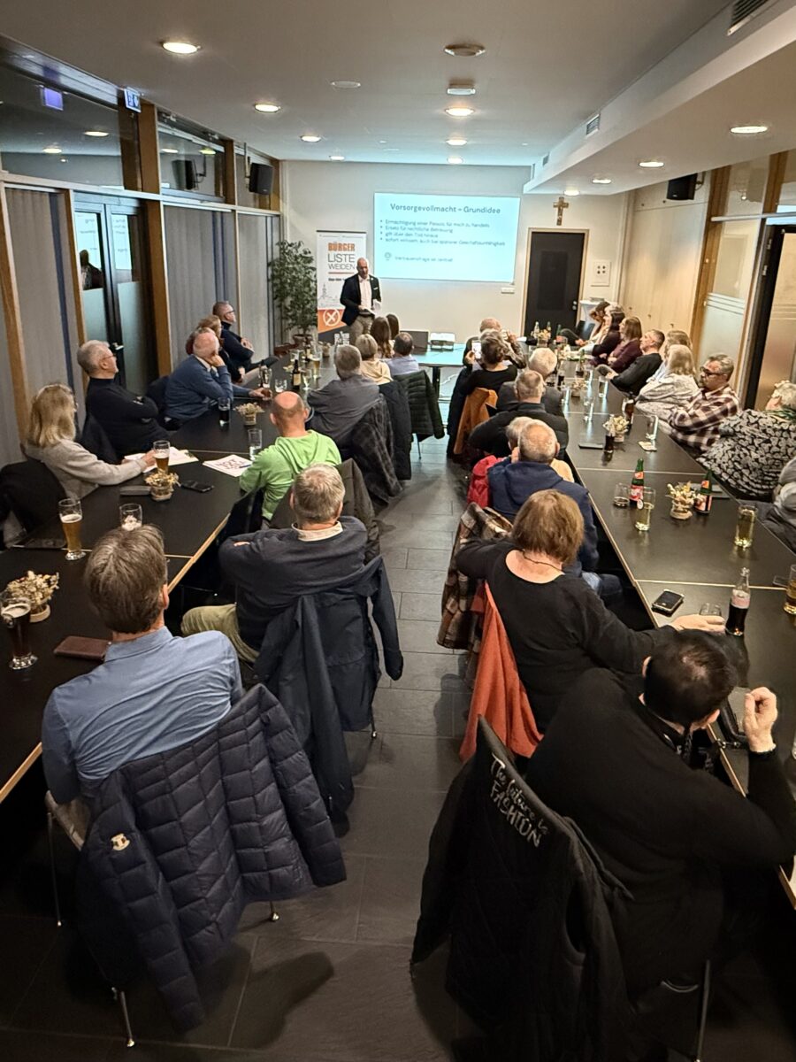 Rechtsanwalt Clemens Sammet, zugleich Kandidat der Bürgerliste, führte fachkundig in die rechtlichen Grundlagen ein. Er erläuterte, wie eine Patientenverfügung im Ernstfall Orientierung geben kann und warum eine Vorsorgevollmacht unverzichtbar ist. Dabei machte er deutlich: „Vorsorge bedeutet Selbstbestimmung – wer rechtzeitig Regelungen trifft, erspart sich und seiner Familie schwierige Entscheidungen in Krisensituationen.“