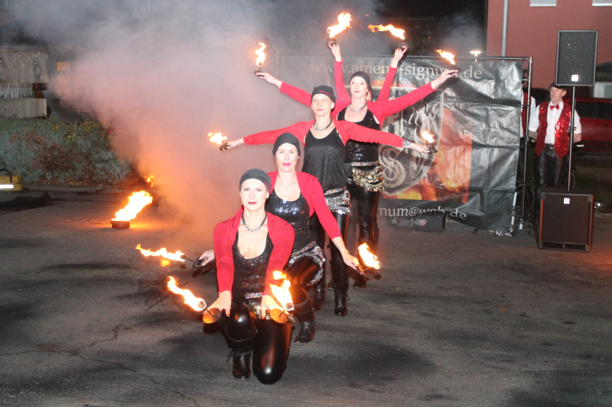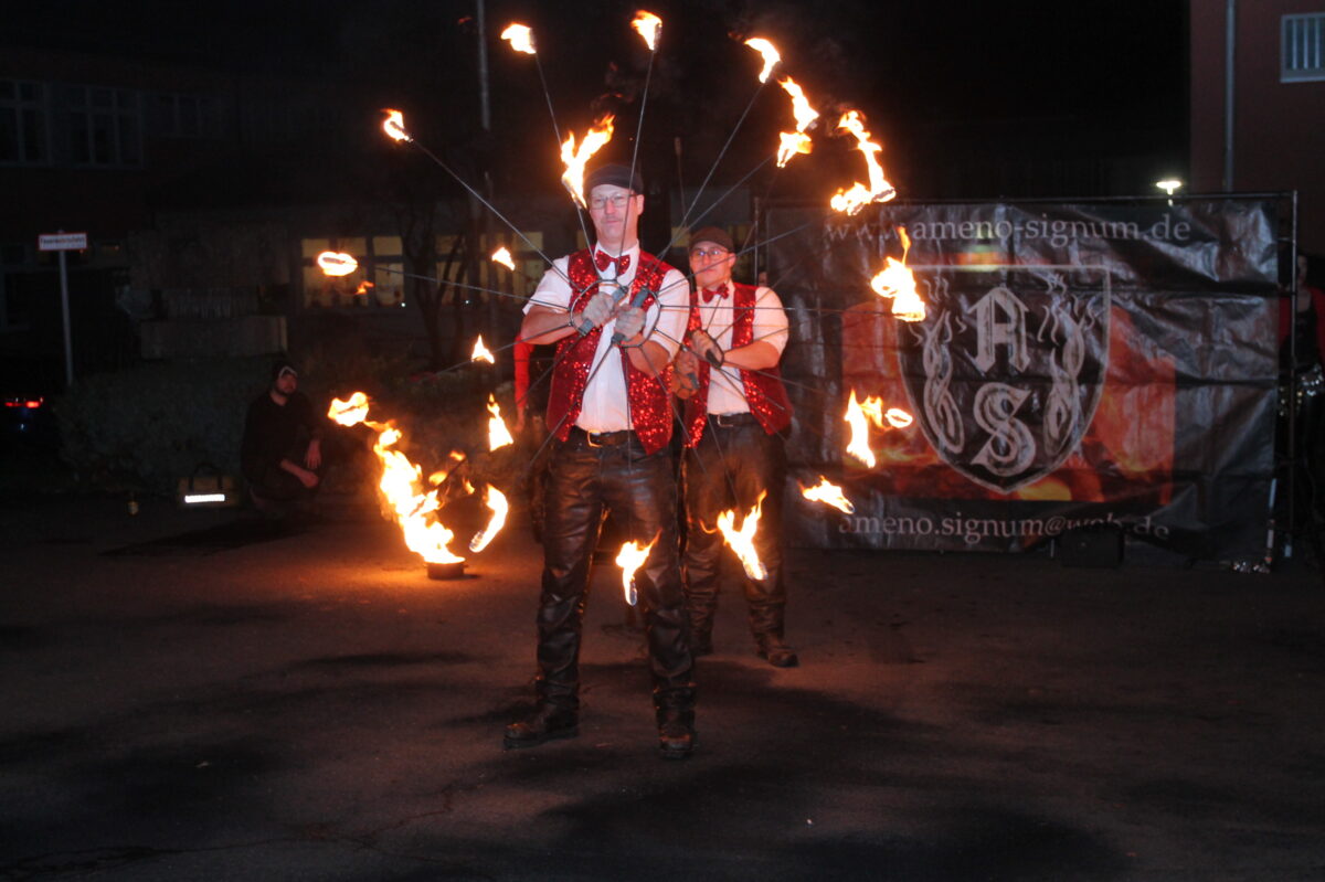 „Jetzt geht’s beim Heimatfest dem offiziellen Ende entgegen“, leitete Bürgermeister Bauriedl gegen 19.30 Uhr den letzten Akt des Festes ein. Ein Fackelzug zum Schulplatz, angeführt von ihm und Tobias Kirner, eröffnete die beeindruckende Feuershow von „Ameno Signum“. Die Gruppe faszinierte mit einer atemberaubenden Vorstellung und bescherte dem Heimatfest einen glanzvollen Abschluss.