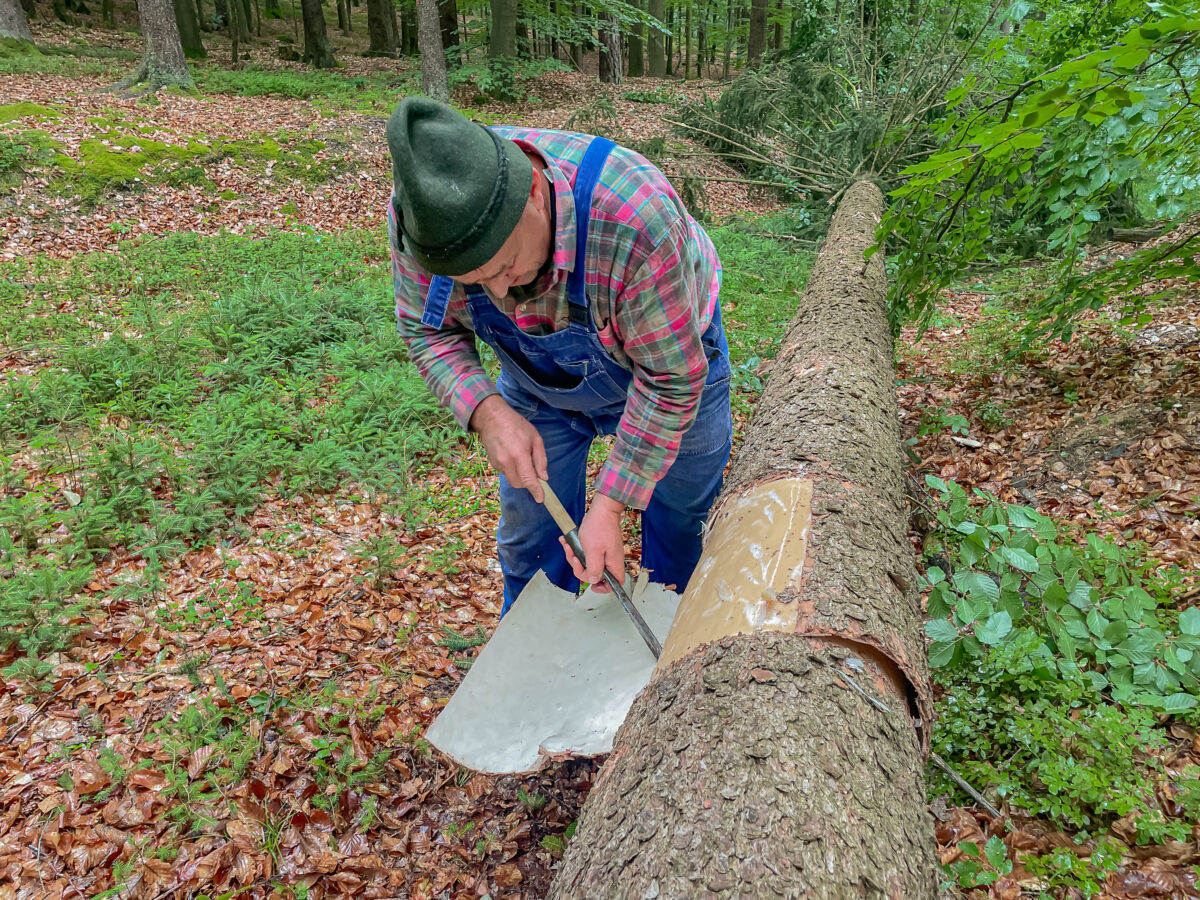 Ein besonderes Meisterstück: Ludwig Arnold fertigte aus der Rinde sogenannte Lohschindeln. Diese flachen Rindenstücke – oft so groß wie ein DIN-A2-Blatt – wurden früher als Dachabdeckung für einfache Hütten im Wald verwendet. „Wenn die Rinde verrottet war, hat man halt eine neue geholt – bei der Menge an Bäumen kein Problem“, erklärt er. Mit einem Spezialmesser schneidet er die Rinde vorsichtig ab, damit sie in großen, intakten Stücken vom Stamm gelöst werden kann – eine fast ausgestorbene Technik.